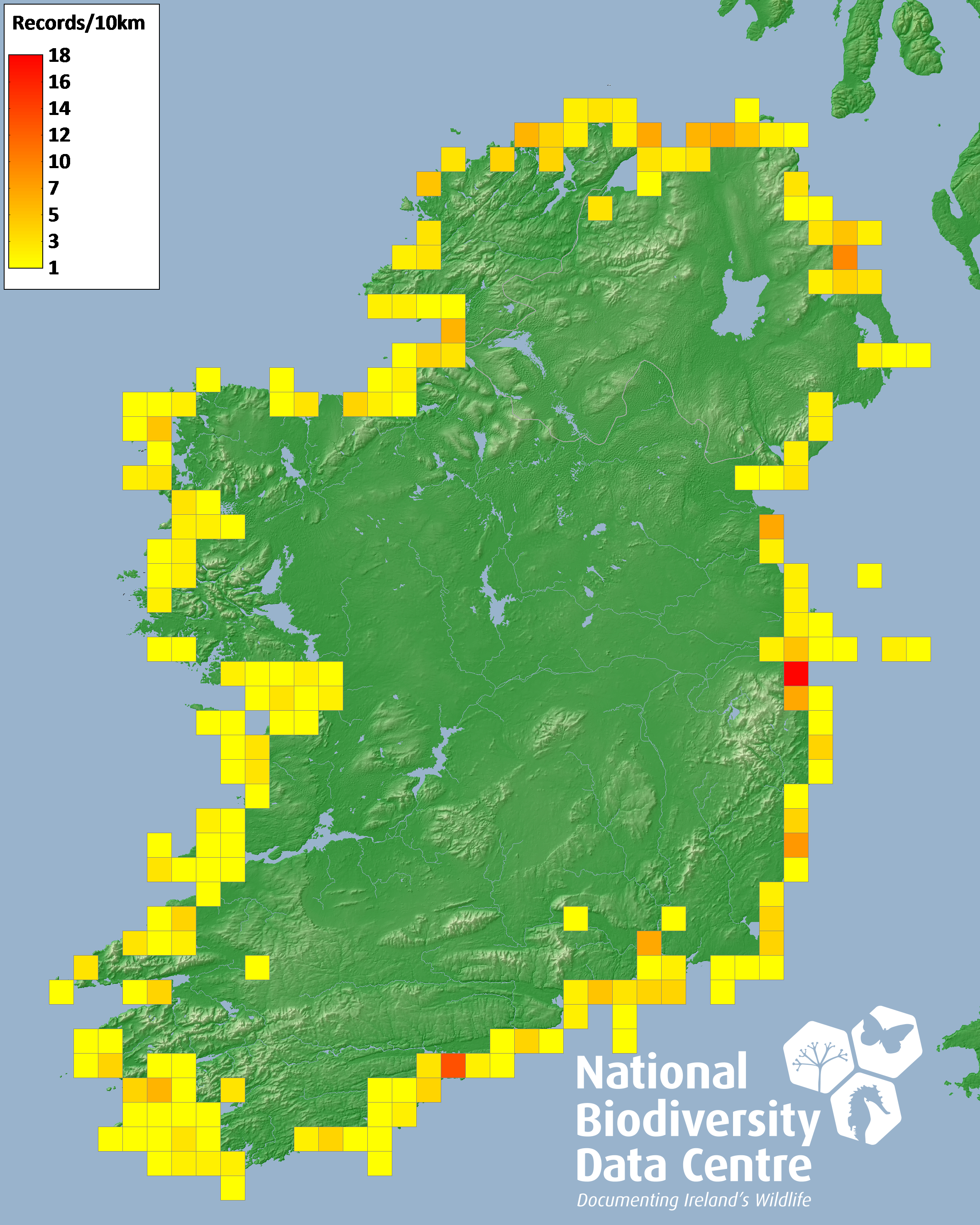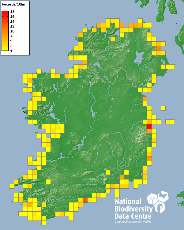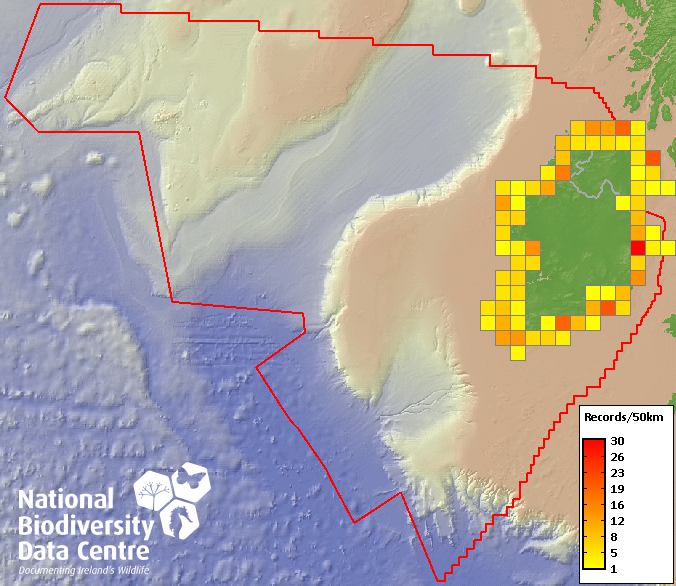 Distribution of the number of records recorded within each 10km grid square (ITM).Marine Map - 50km