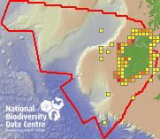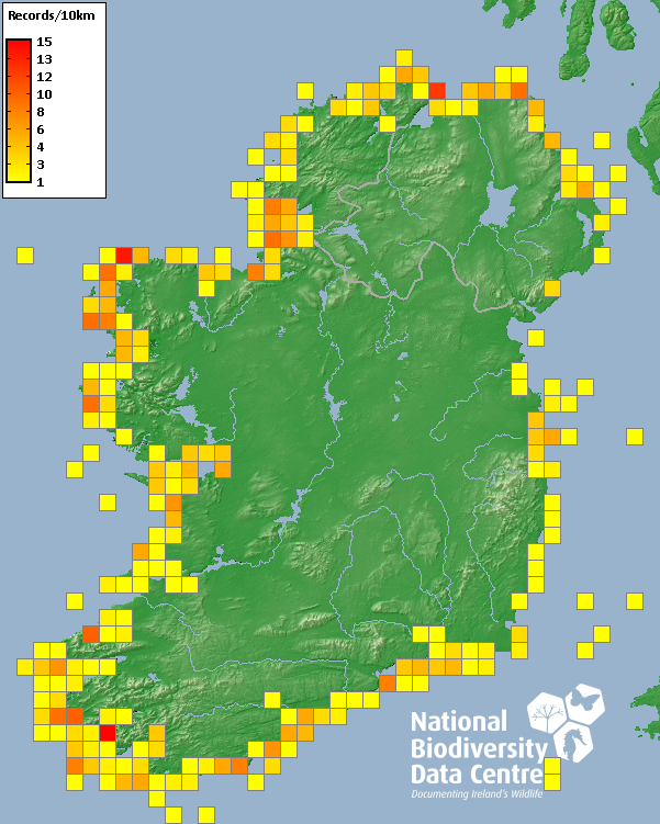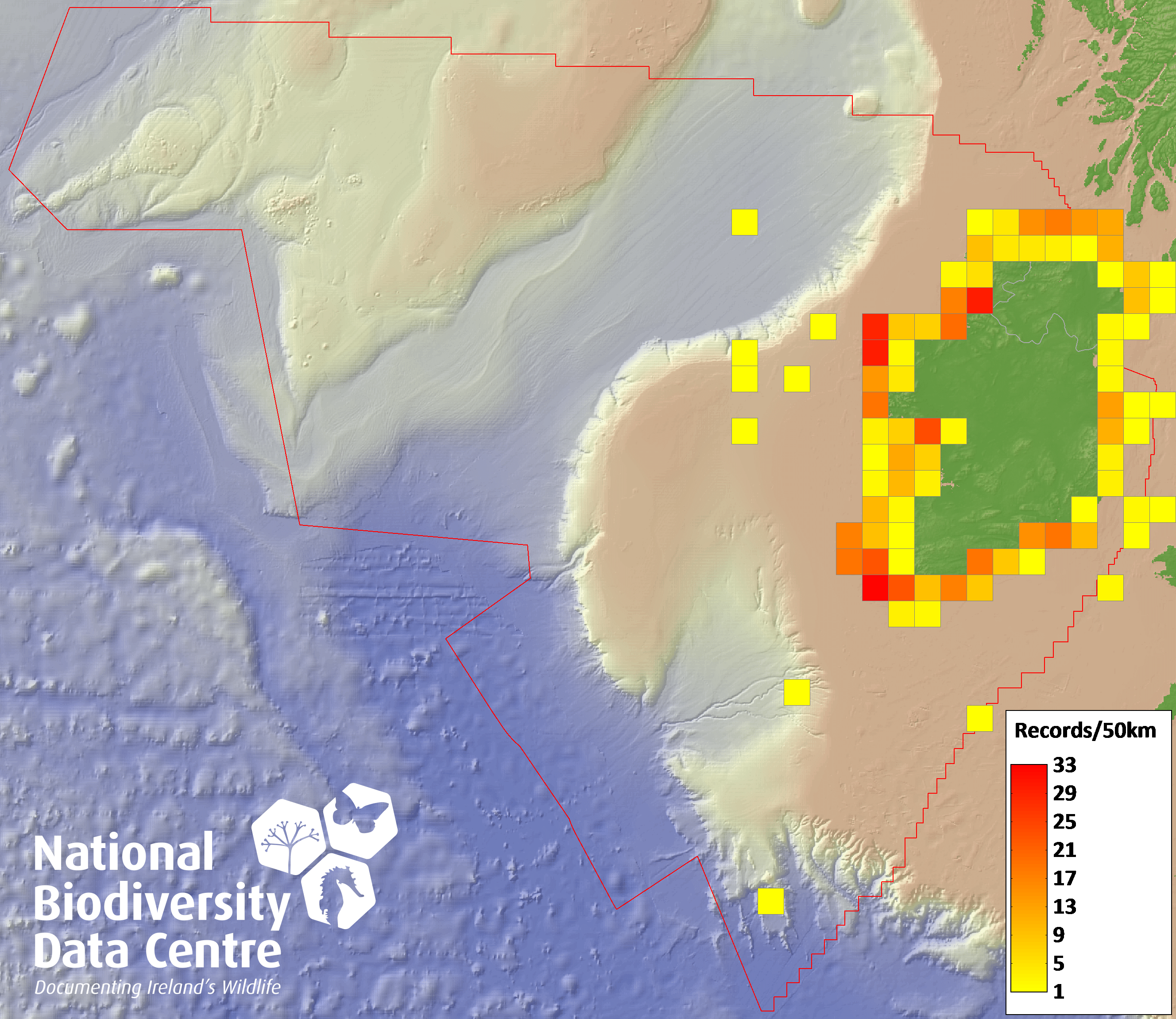 Distribution of the number of records recorded within each 10km grid square (ITM).Marine Map - 50km