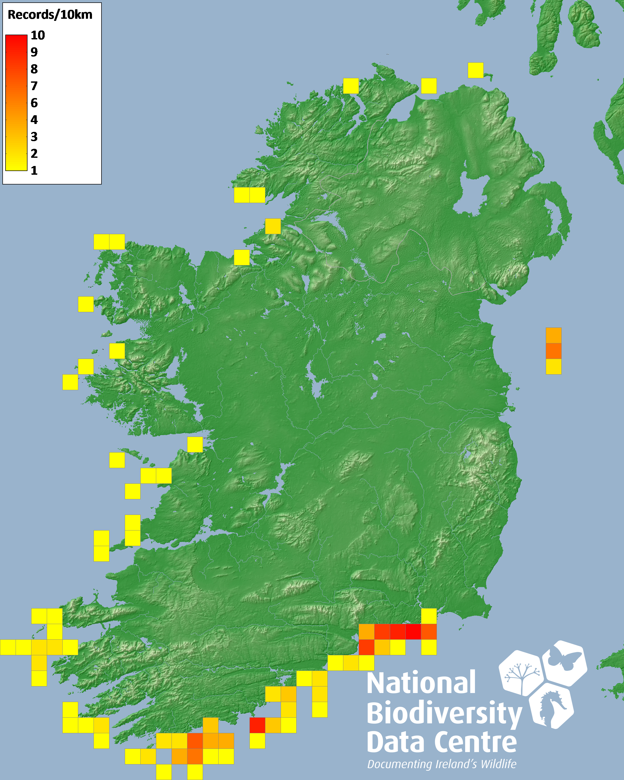 Distribution of the number of records recorded within each 10km grid square (ITM).Marine Map - 50km