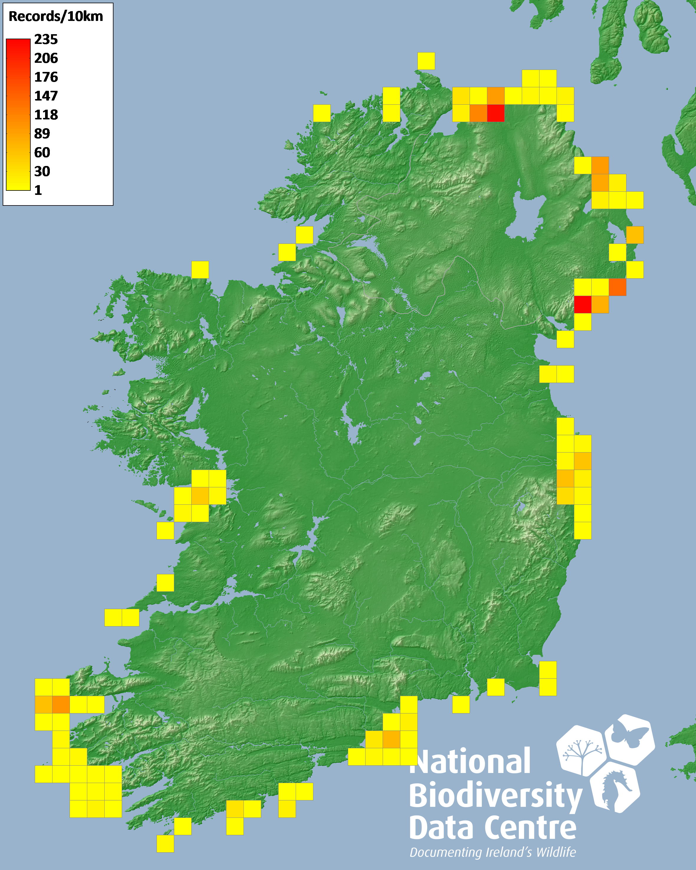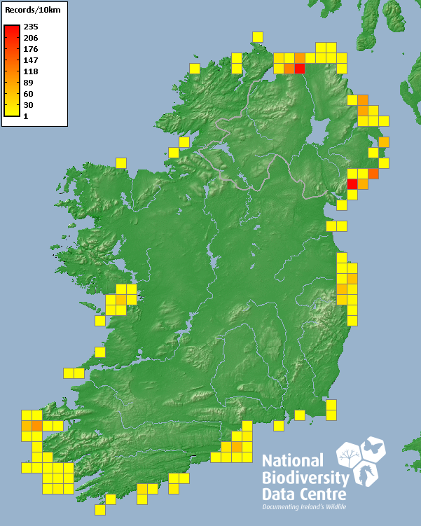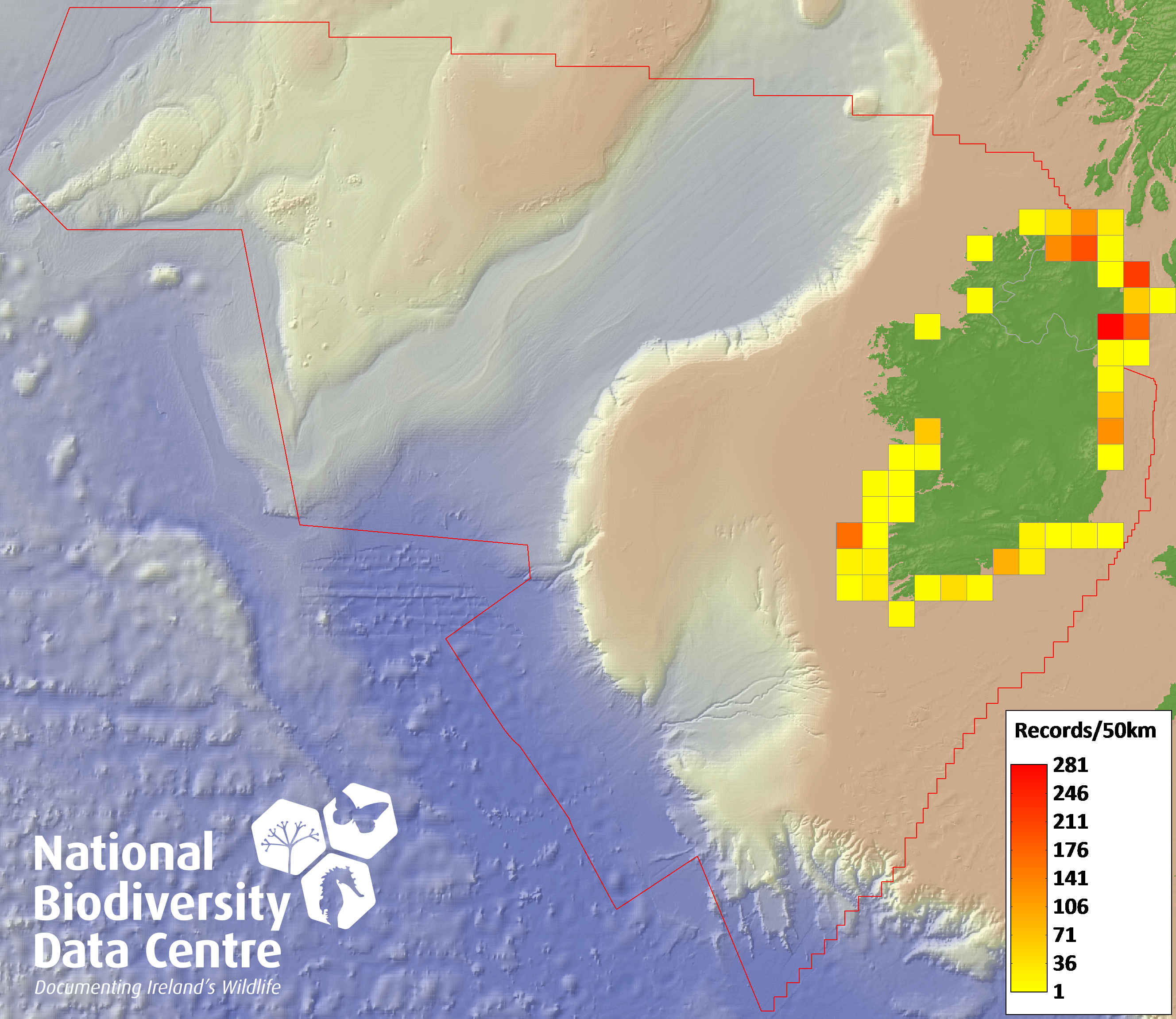 Distribution of the number of records recorded within each 10km grid square (ITM).Marine Map - 50km