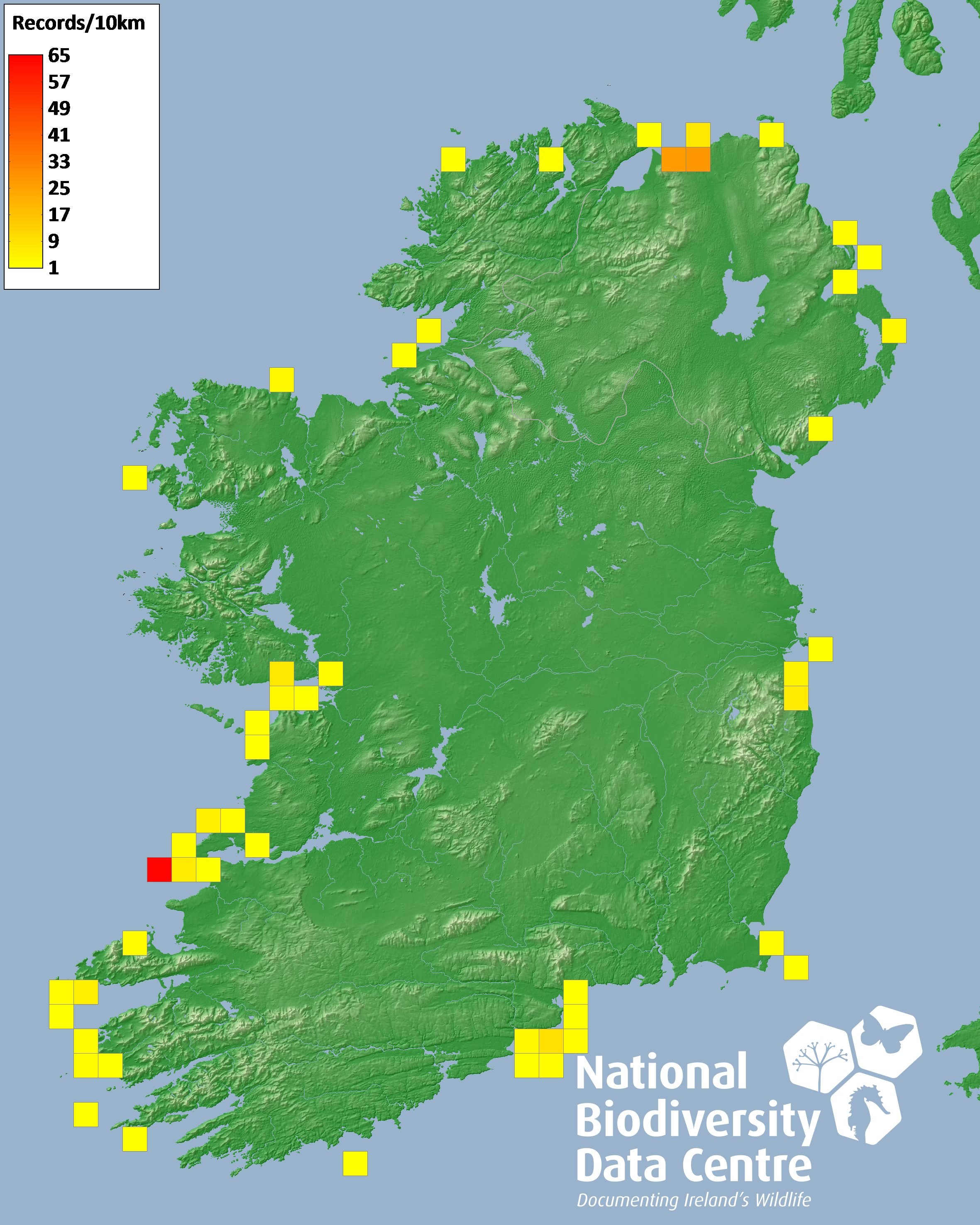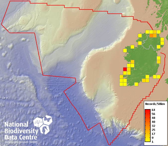 Distribution of the number of records recorded within each 10km grid square (ITM).Marine Map - 50km