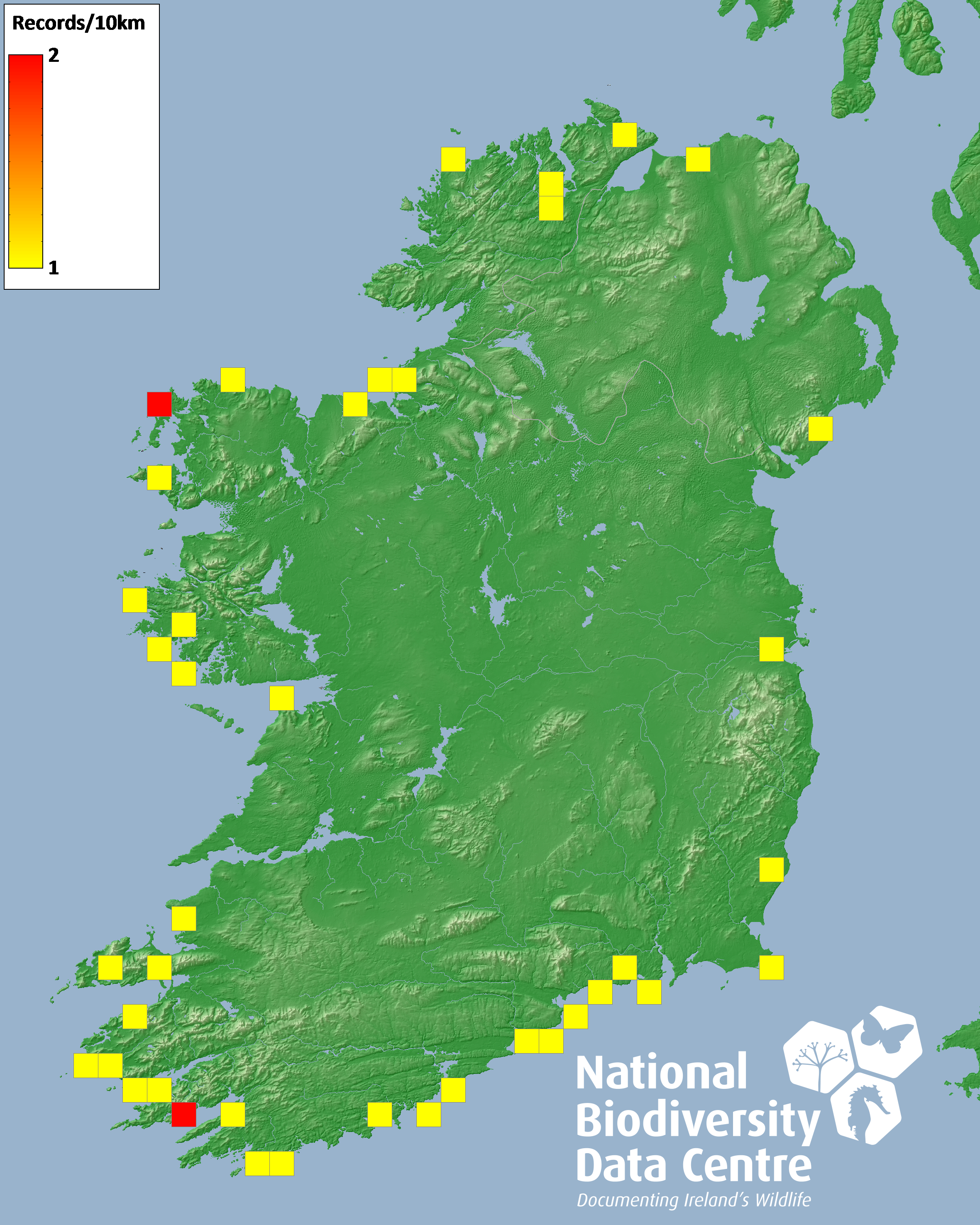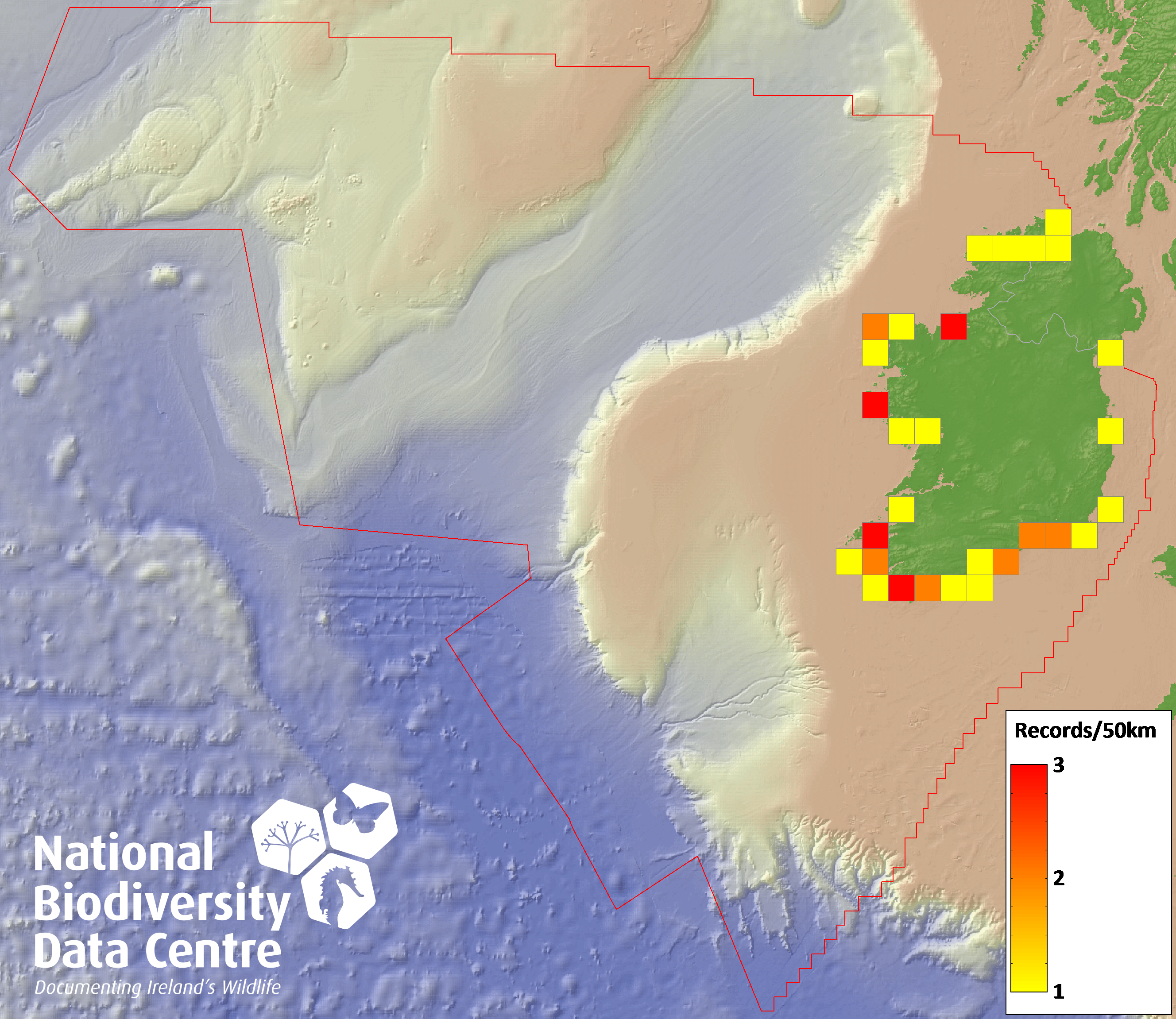 Distribution of the number of records recorded within each 10km grid square (ITM).Marine Map - 50km