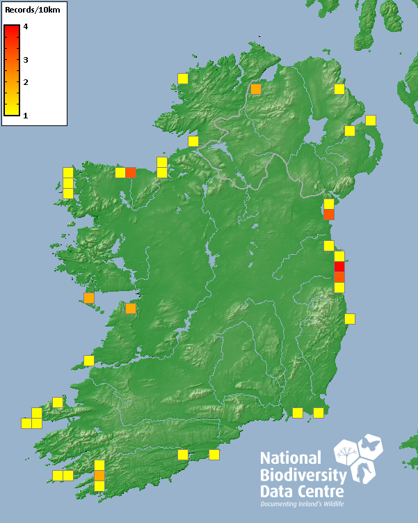 Distribution of the number of records recorded within each 10km grid square (ITM).Marine Map - 50km