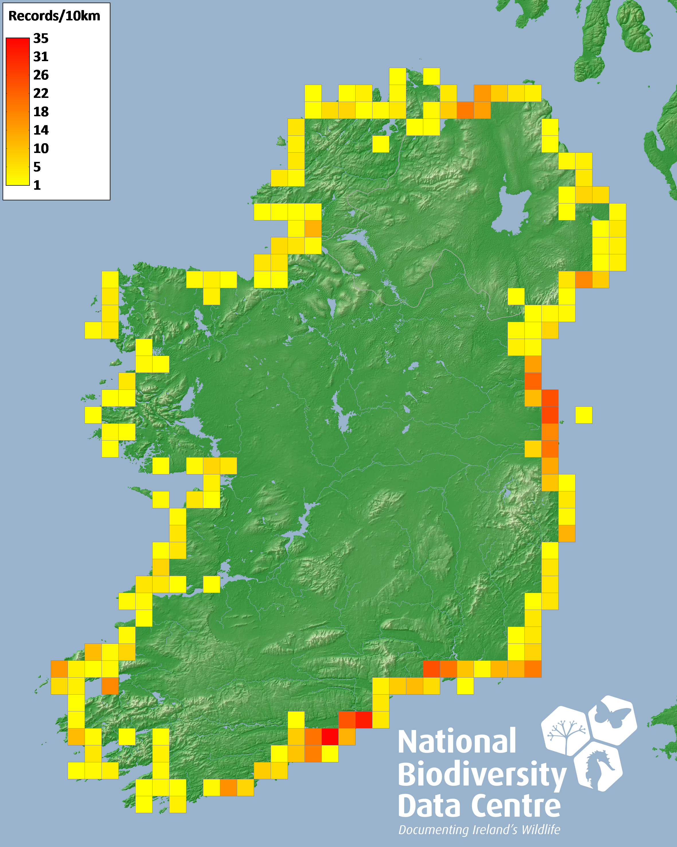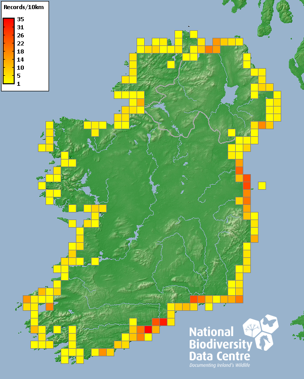 Distribution of the number of records recorded within each 10km grid square (ITM).Marine Map - 50km