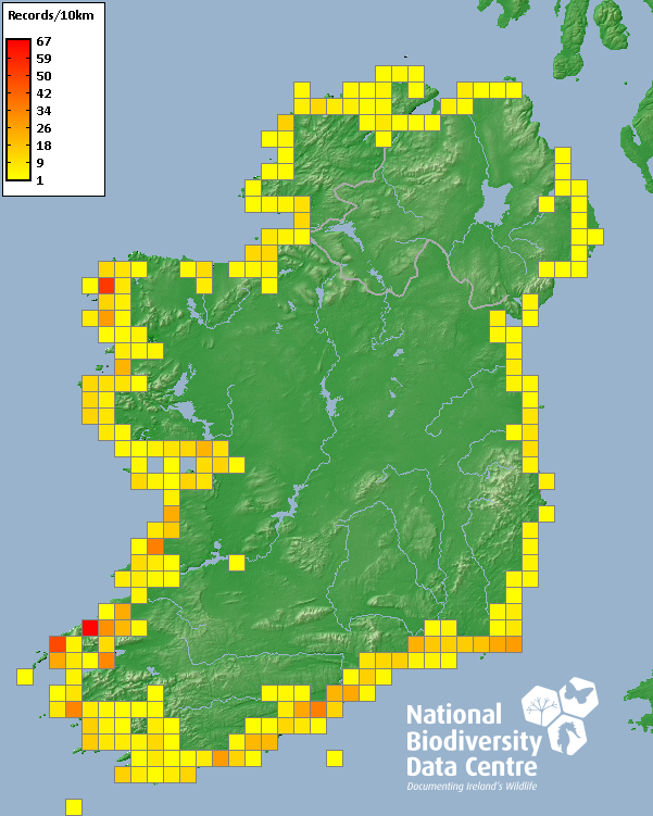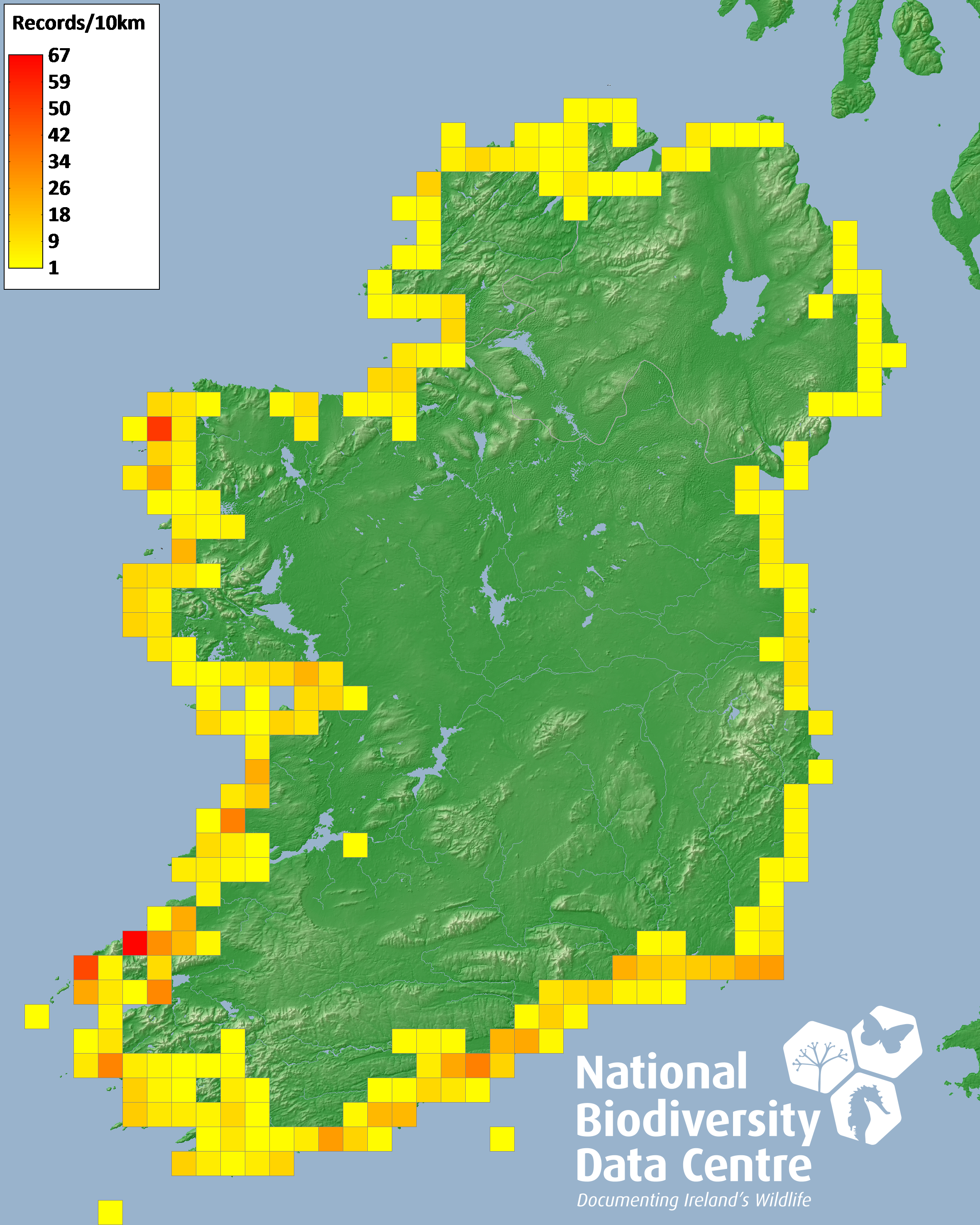 Distribution of the number of records recorded within each 10km grid square (ITM).Marine Map - 50km