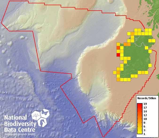 Distribution of the number of records recorded within each 10km grid square (ITM).Marine Map - 50km