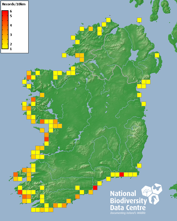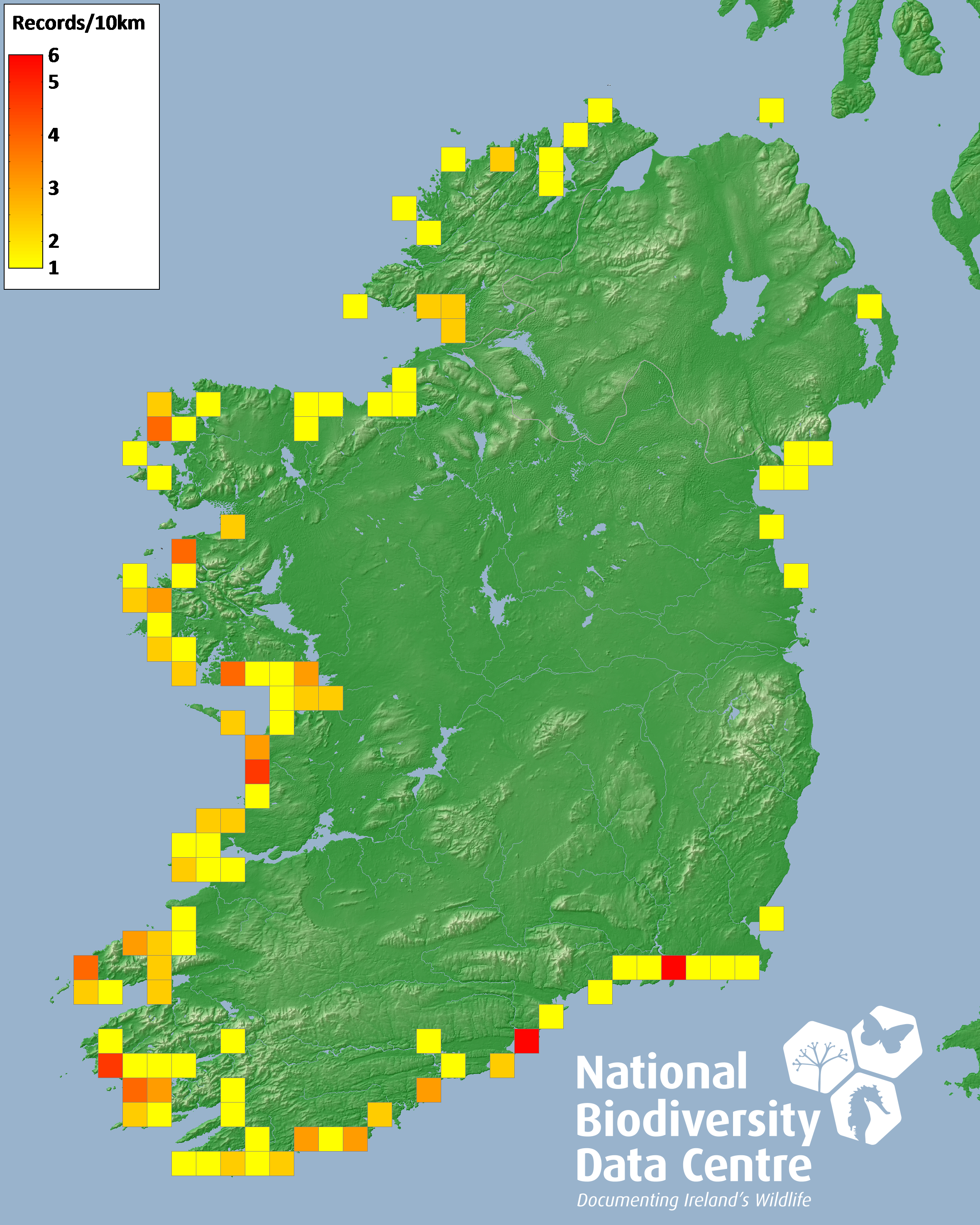 Distribution of the number of records recorded within each 10km grid square (ITM).Marine Map - 50km