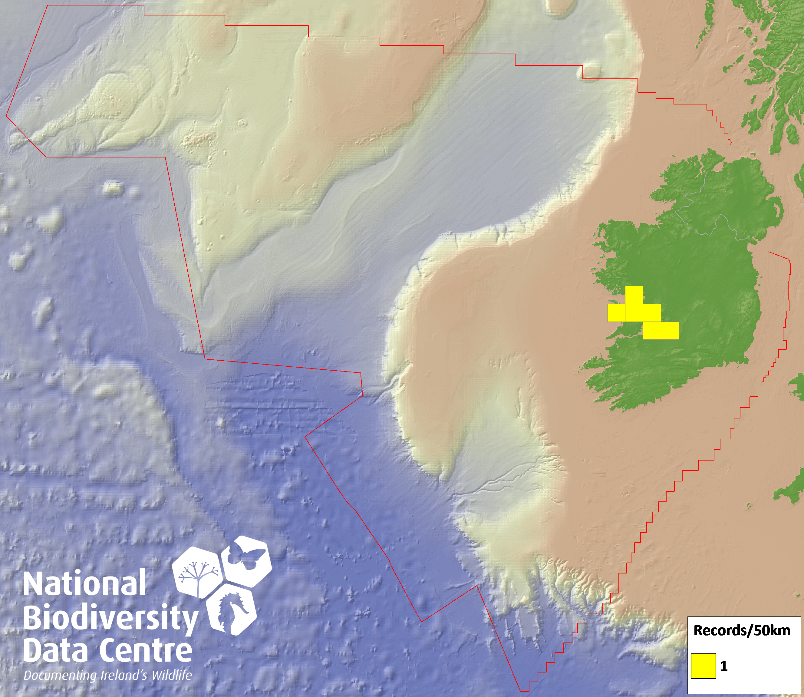 Distribution of the number of records recorded within each 10km grid square (ITM).Marine Map - 50km