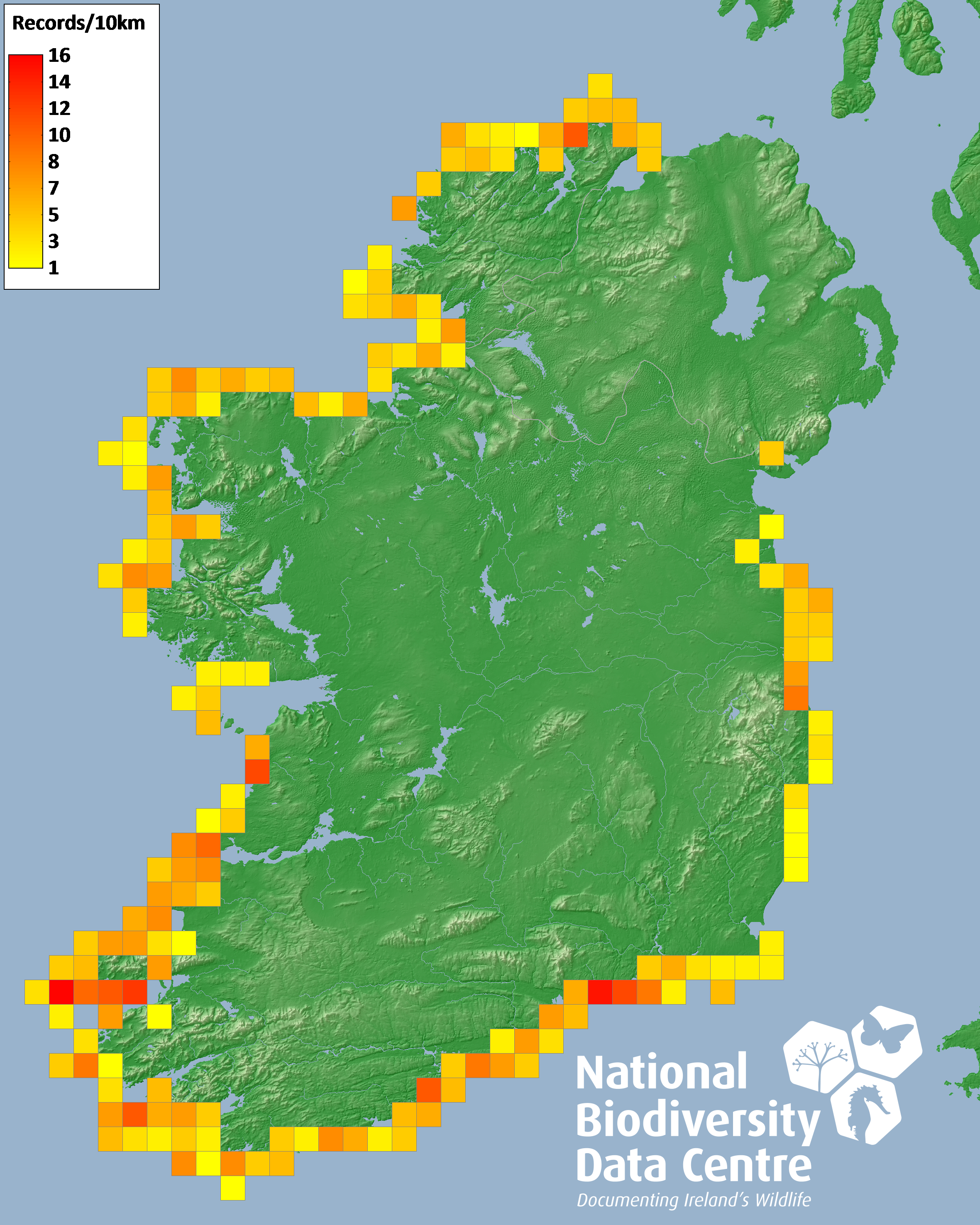 Distribution of the number of records recorded within each 10km grid square (ITM).Marine Map - 50km