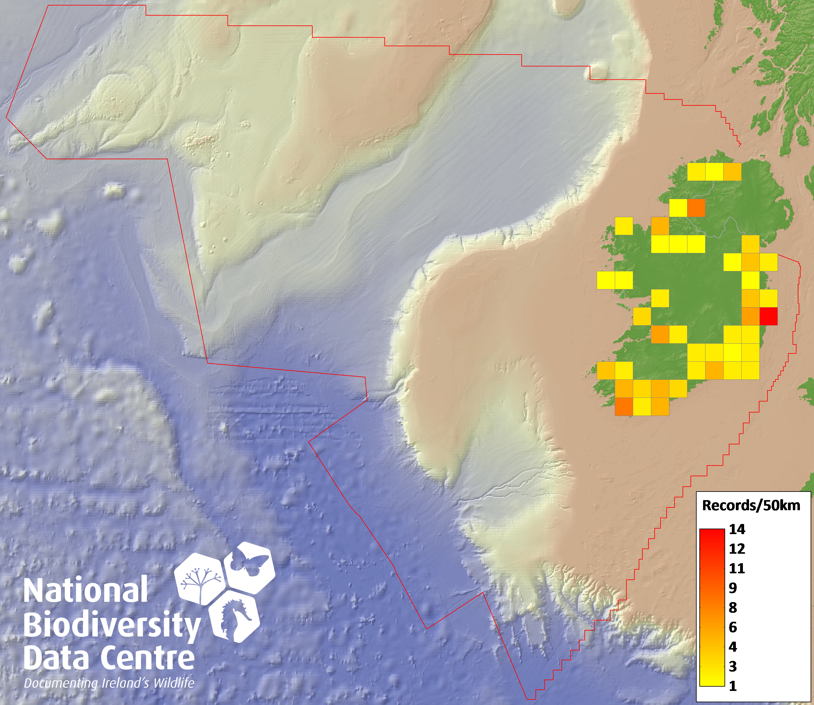 Distribution of the number of records recorded within each 10km grid square (ITM).Marine Map - 50km