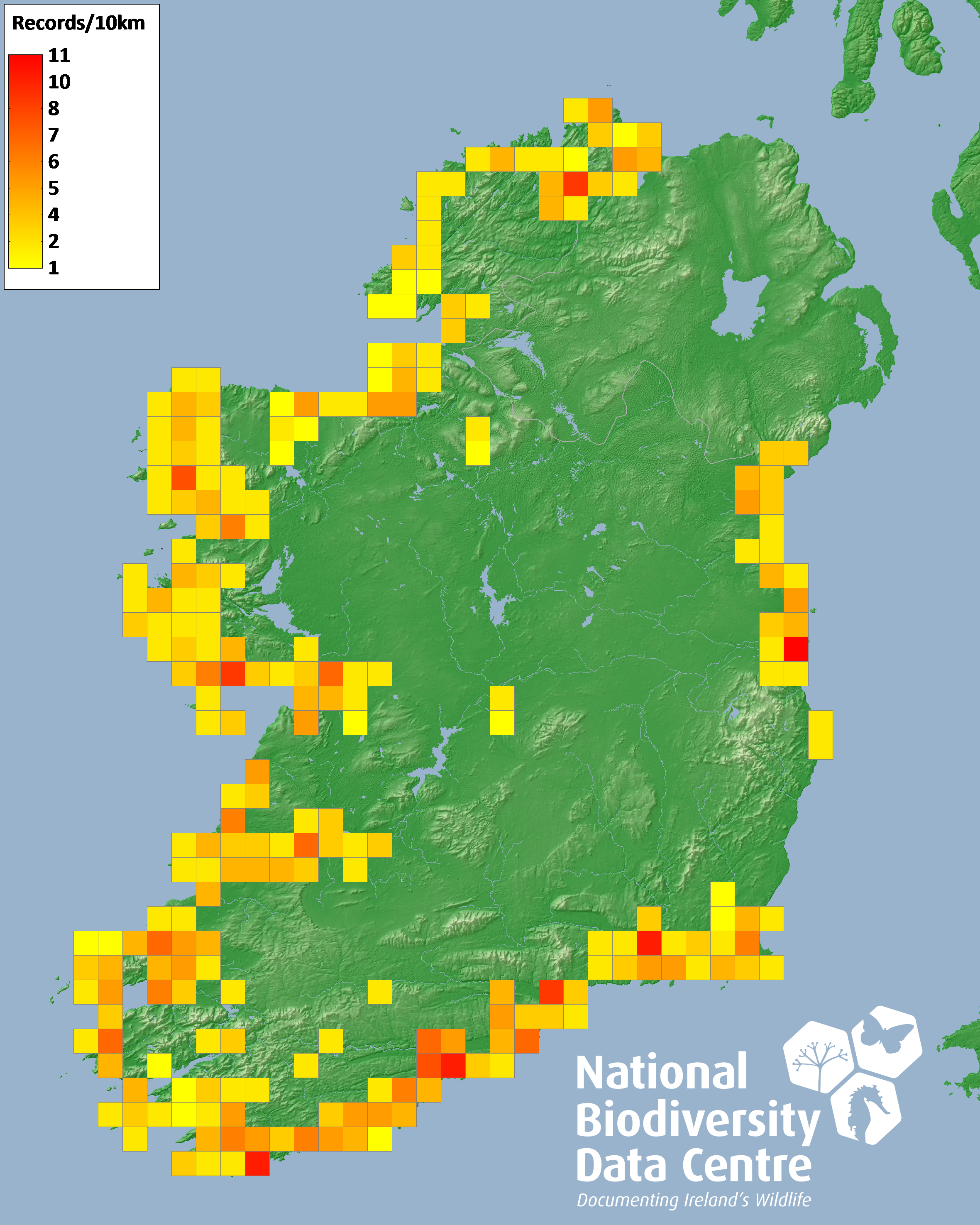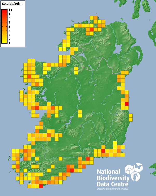 Distribution of the number of records recorded within each 10km grid square (ITM).Marine Map - 50km