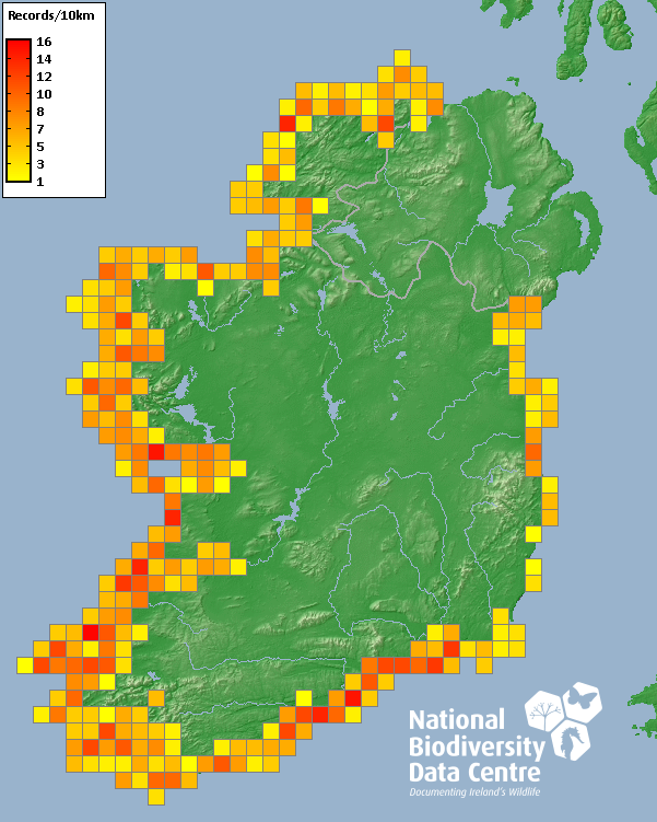 Distribution of the number of records recorded within each 10km grid square (ITM).Marine Map - 50km