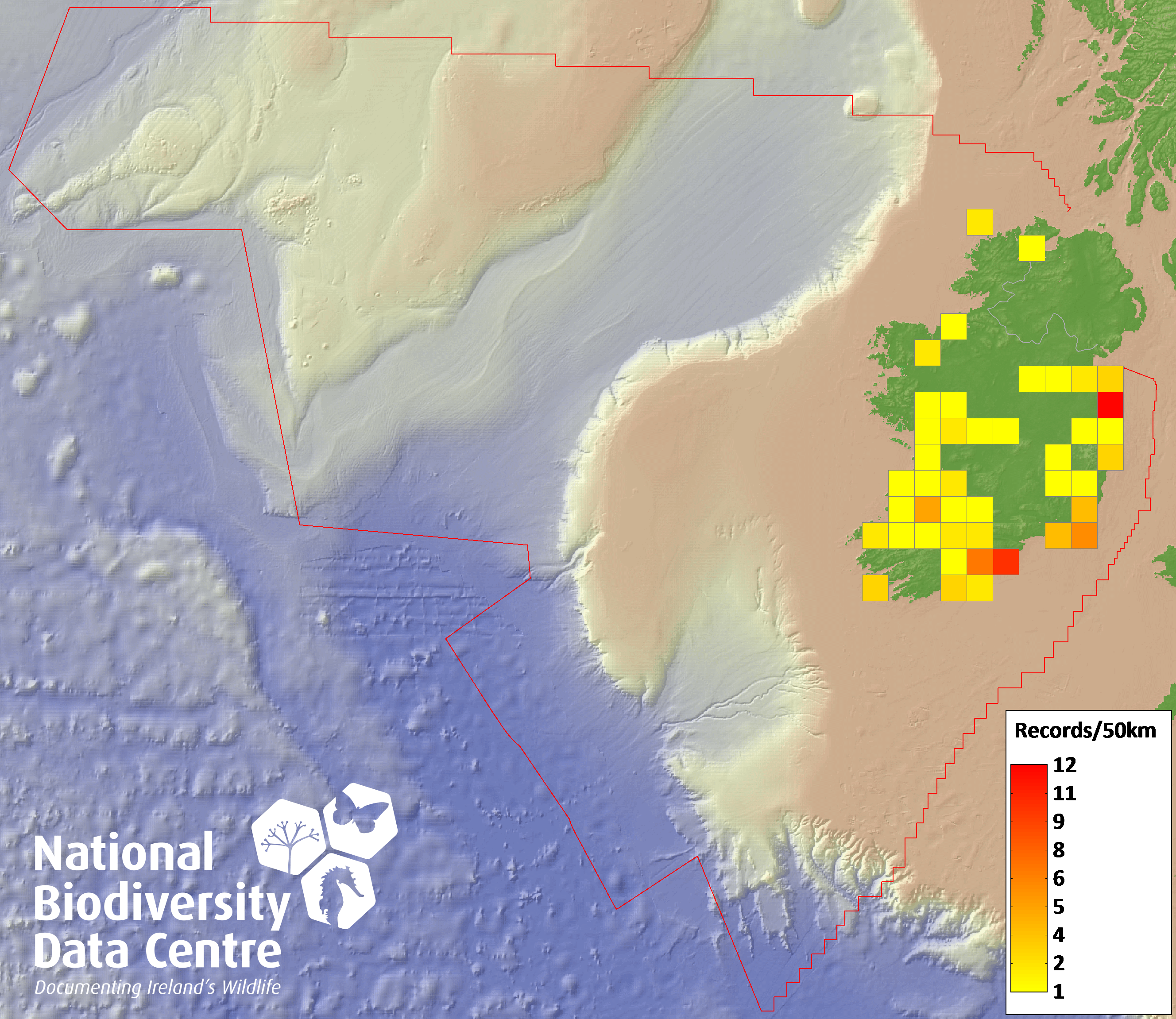 Distribution of the number of records recorded within each 10km grid square (ITM).Marine Map - 50km