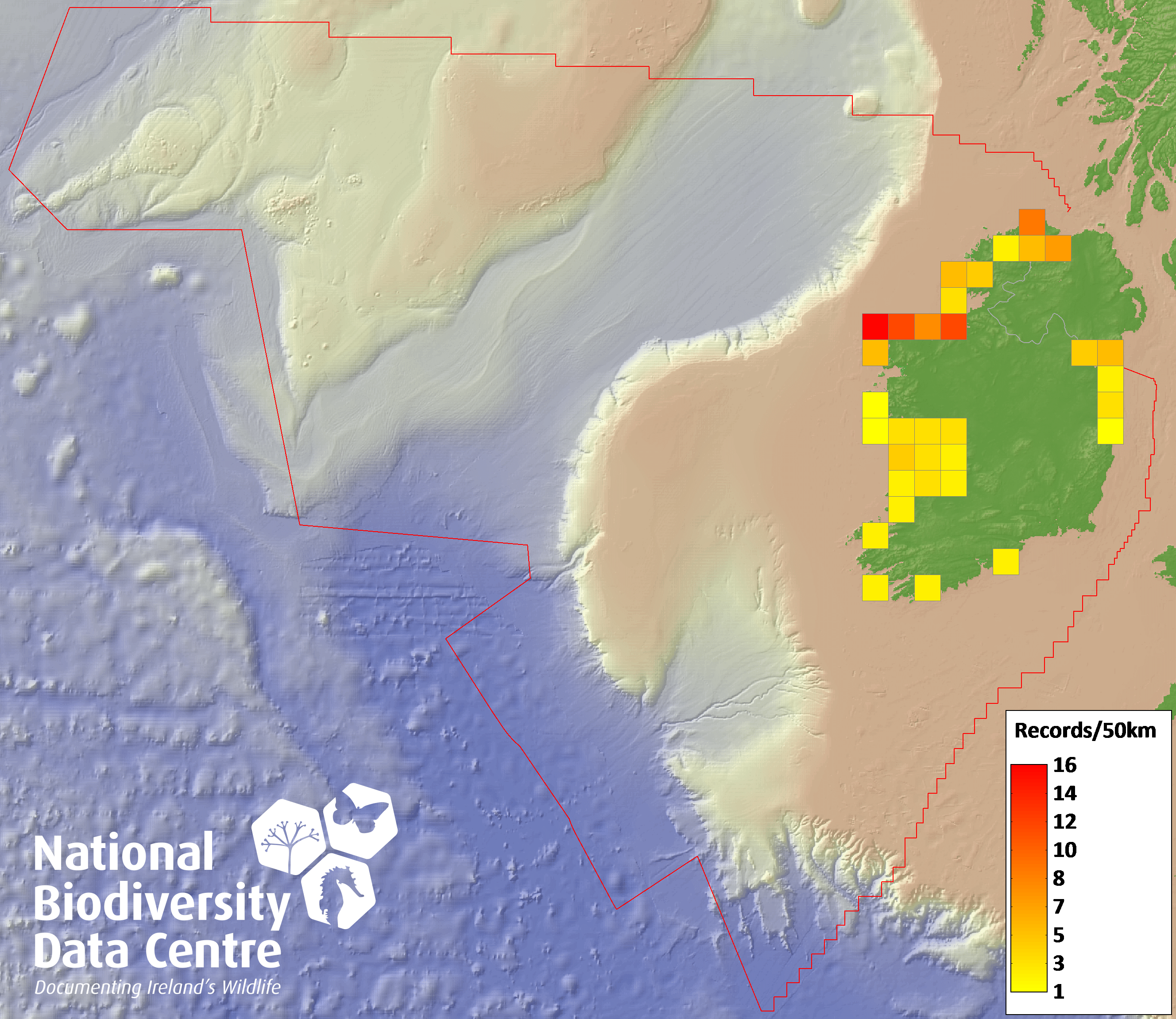Distribution of the number of records recorded within each 10km grid square (ITM).Marine Map - 50km