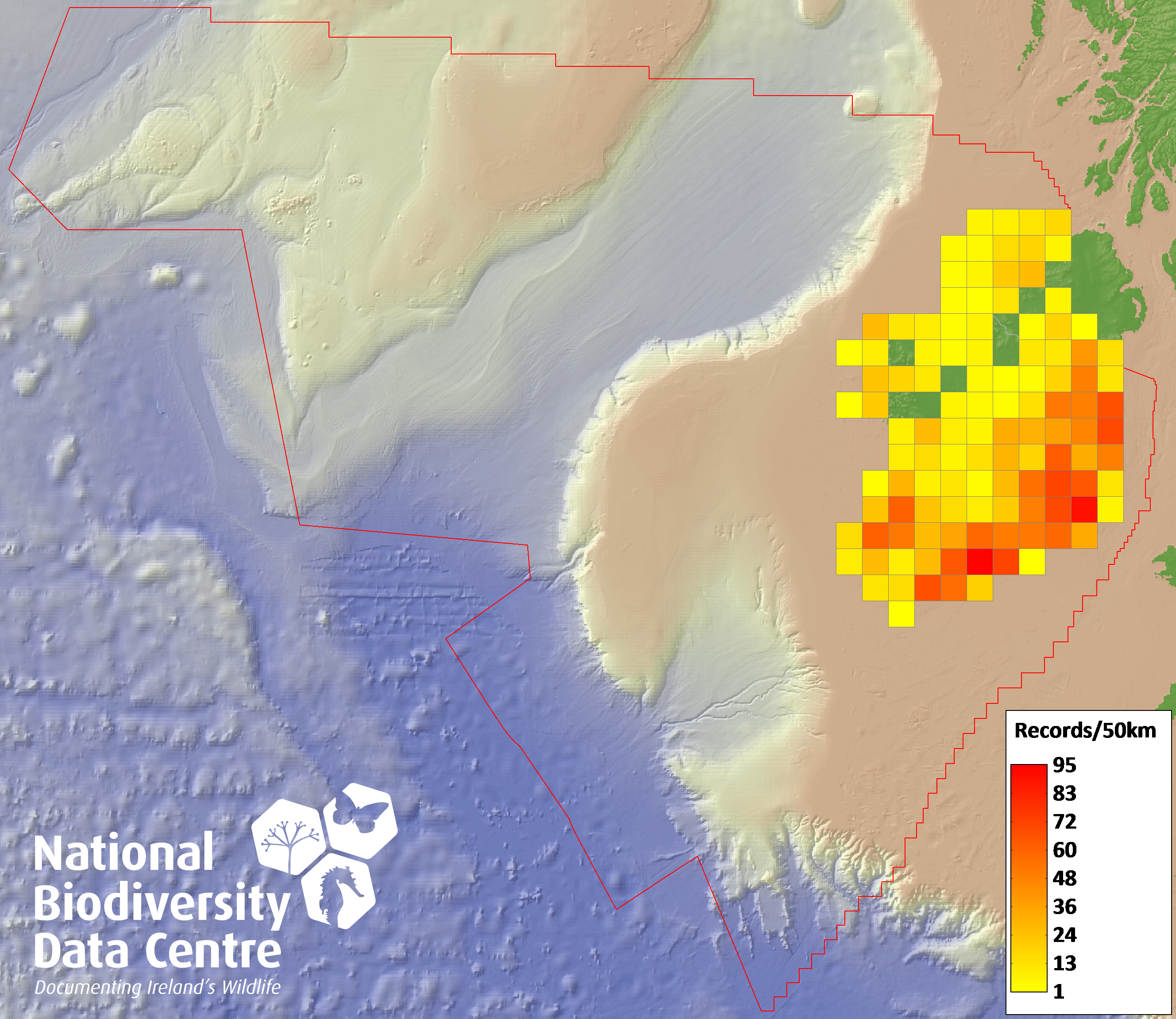 Distribution of the number of records recorded within each 10km grid square (ITM).Marine Map - 50km