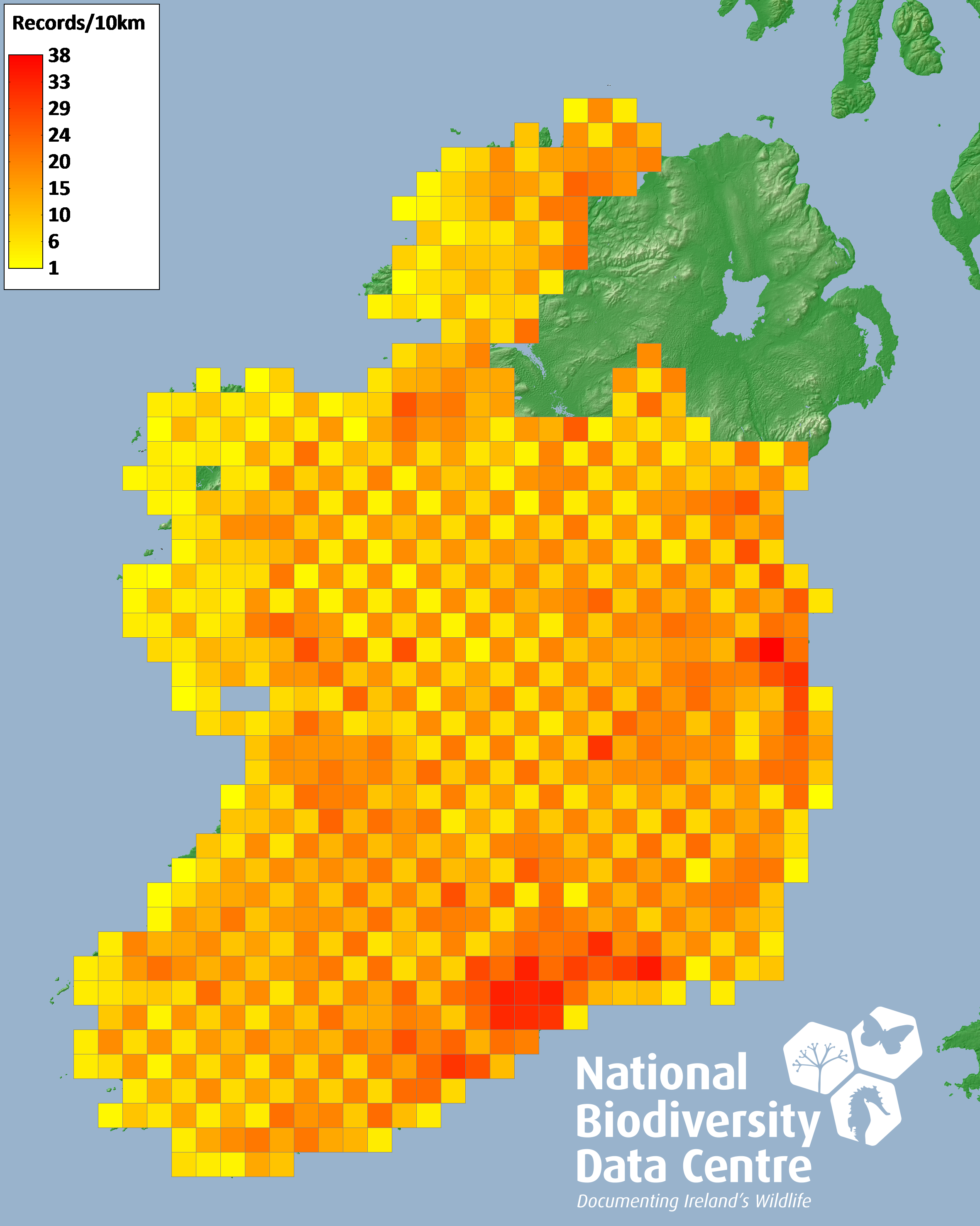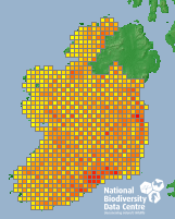 Distribution of the number of records recorded within each 10km grid square (ITM).Marine Map - 50km