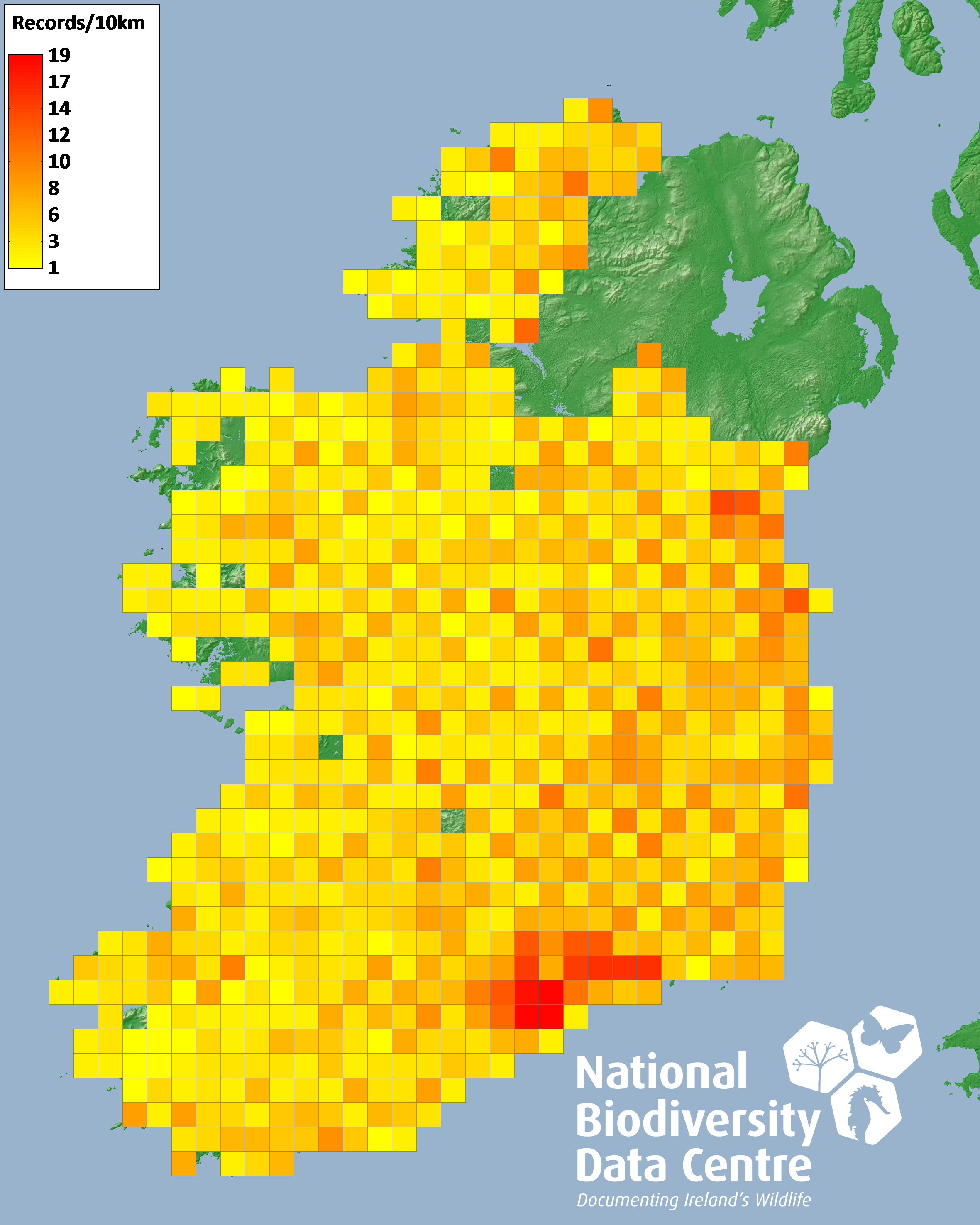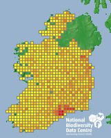 Distribution of the number of records recorded within each 10km grid square (ITM).Marine Map - 50km
