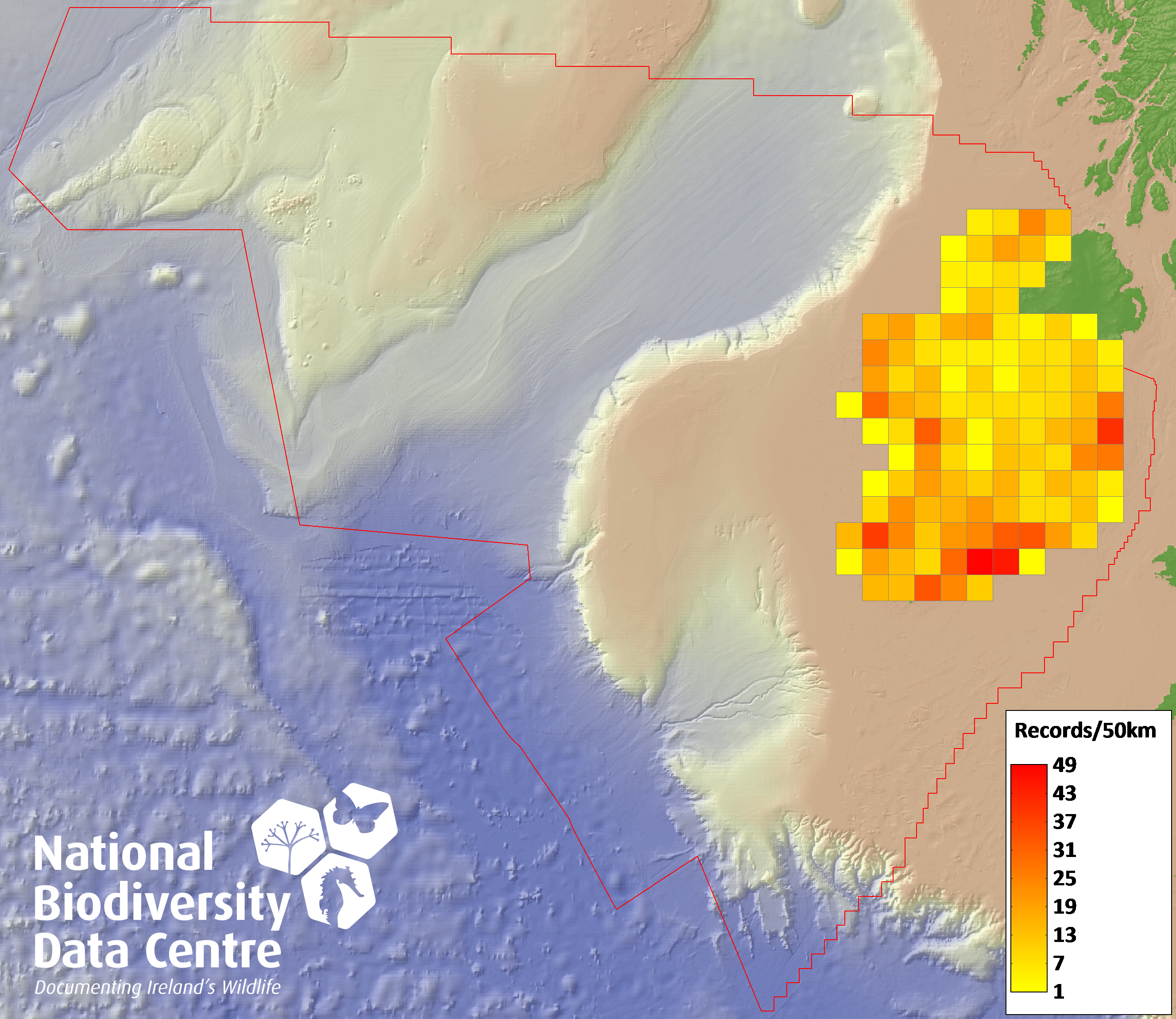 Distribution of the number of records recorded within each 10km grid square (ITM).Marine Map - 50km