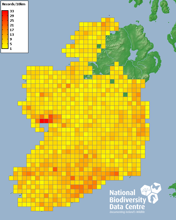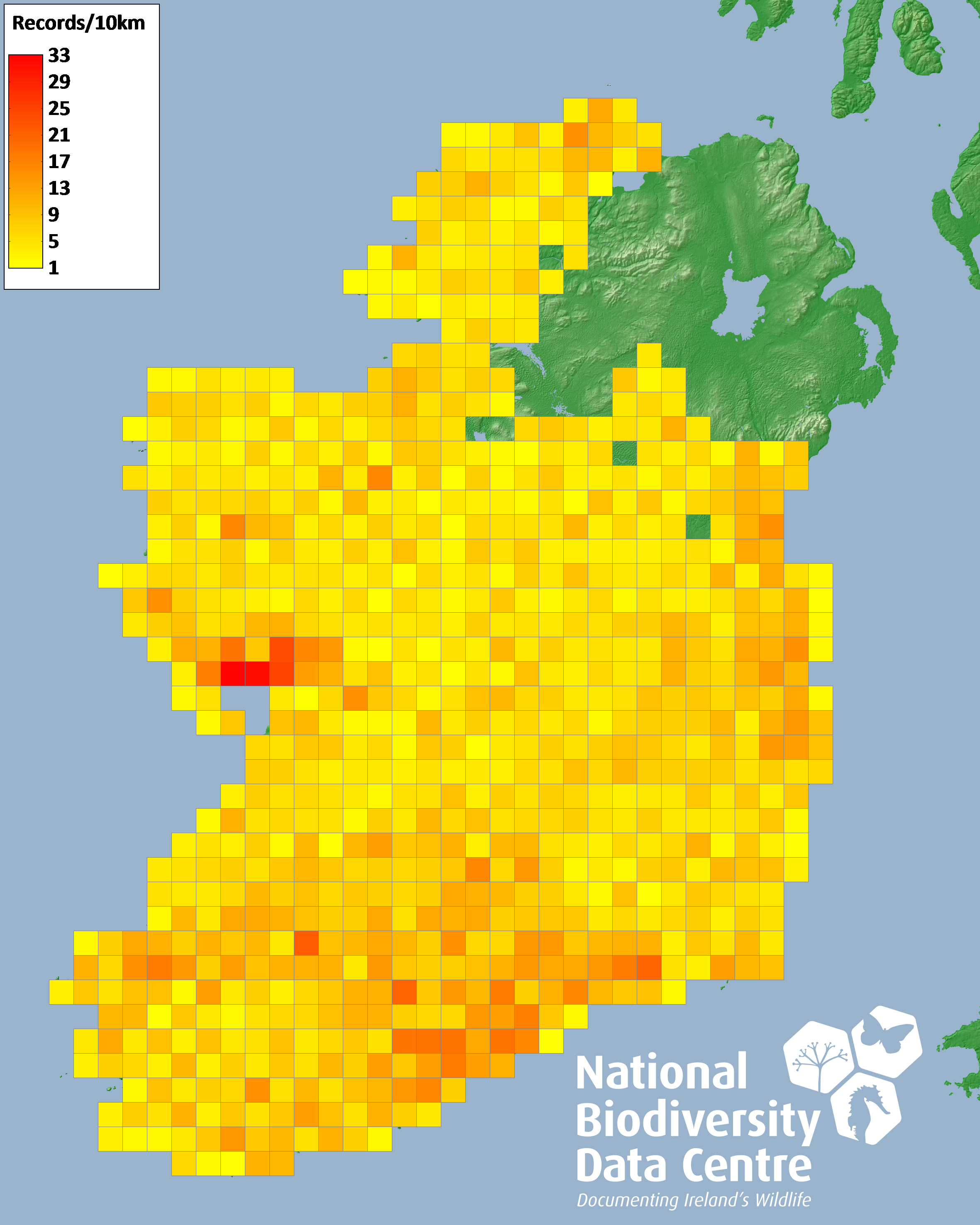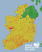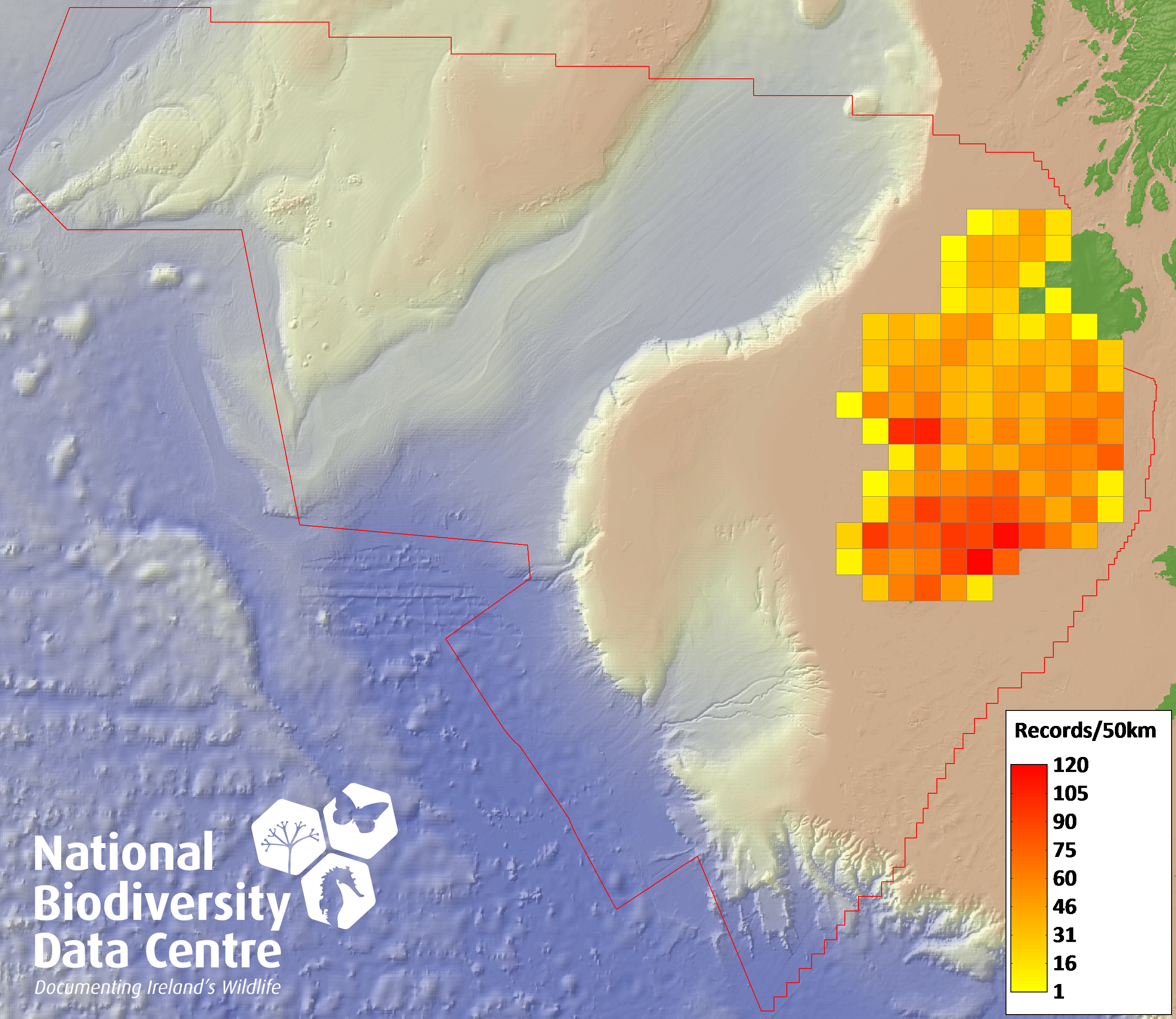 Distribution of the number of records recorded within each 10km grid square (ITM).Marine Map - 50km