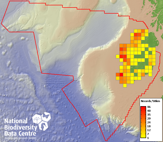 Distribution of the number of records recorded within each 10km grid square (ITM).Marine Map - 50km