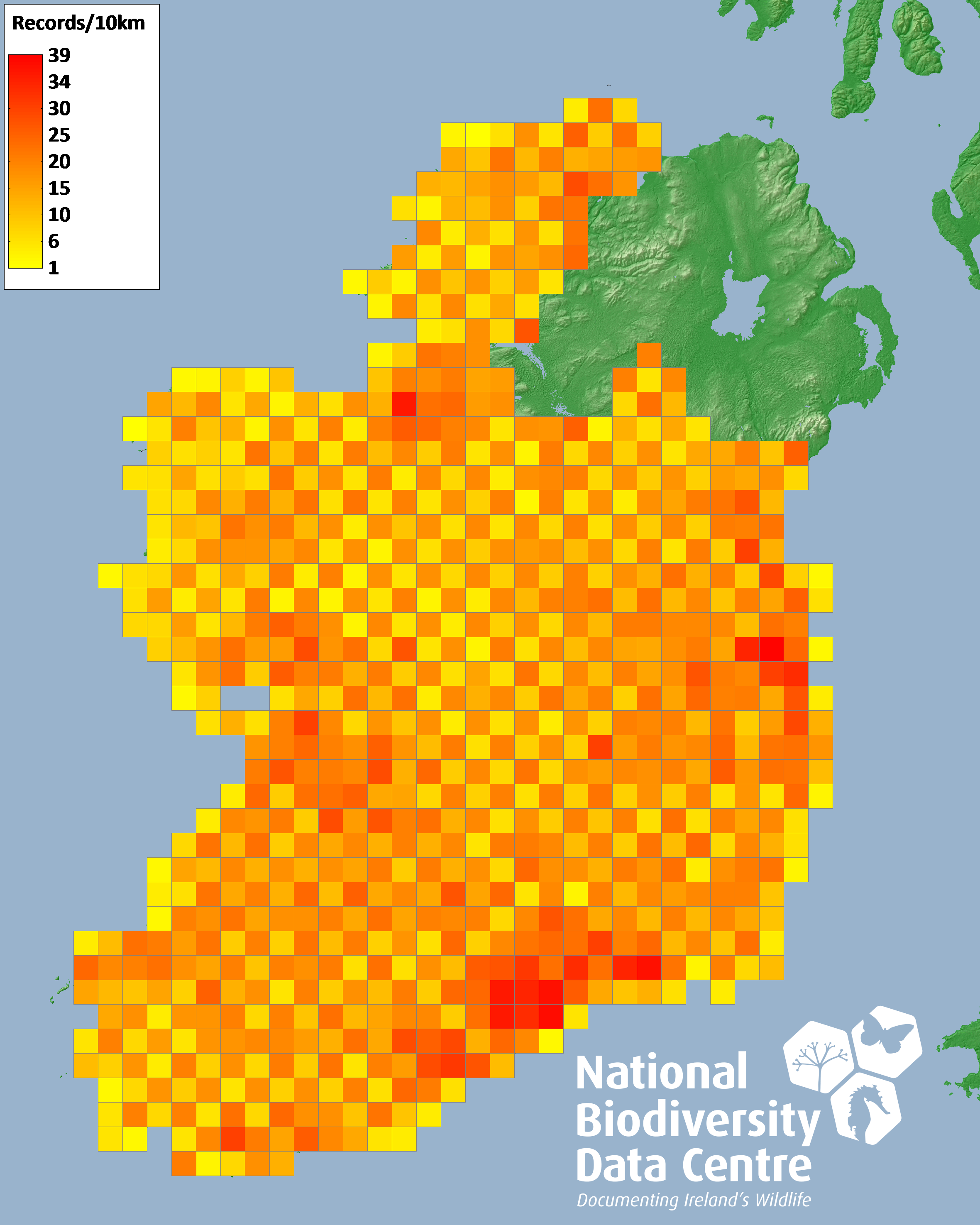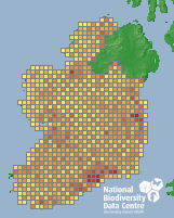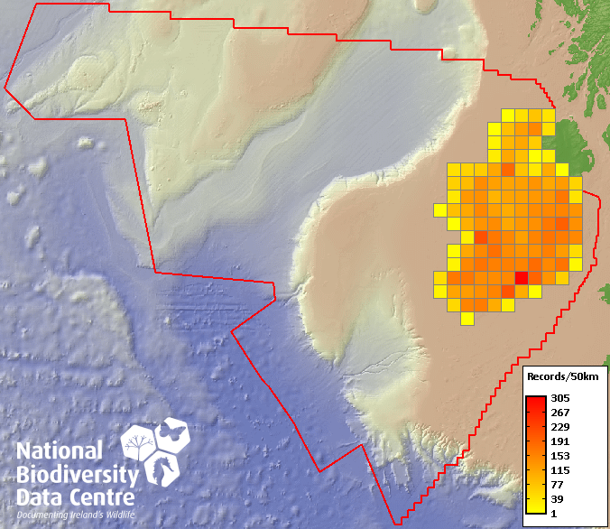 Distribution of the number of records recorded within each 10km grid square (ITM).Marine Map - 50km