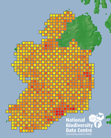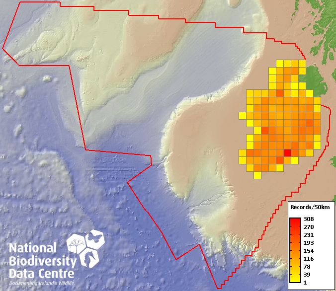 Distribution of the number of records recorded within each 10km grid square (ITM).Marine Map - 50km
