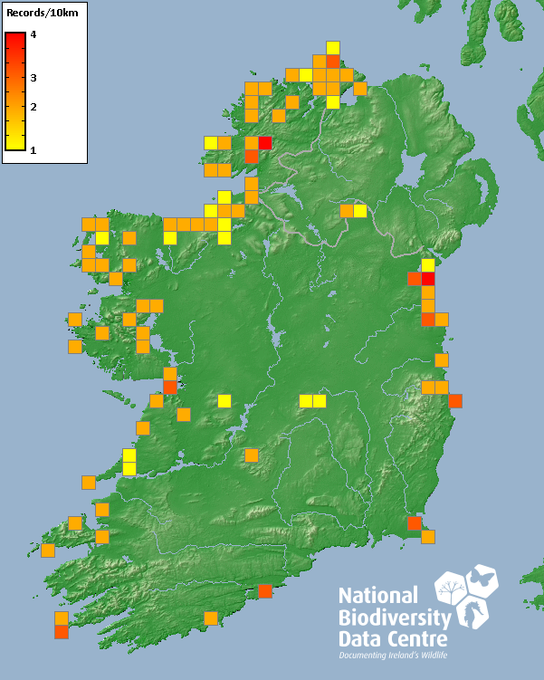 Distribution of the number of records recorded within each 10km grid square (ITM).Marine Map - 50km