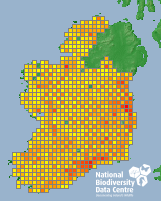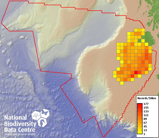 Distribution of the number of records recorded within each 10km grid square (ITM).Marine Map - 50km