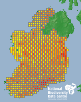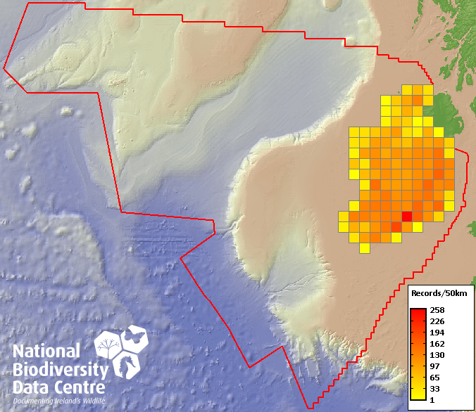 Distribution of the number of records recorded within each 10km grid square (ITM).Marine Map - 50km
