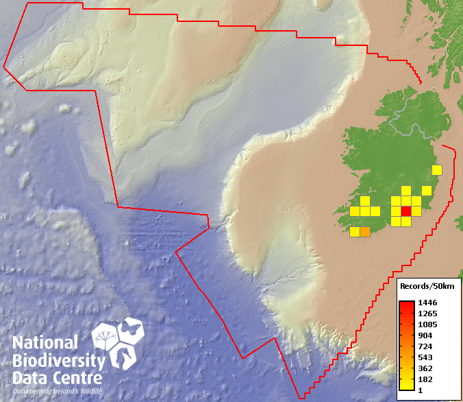 Distribution of the number of records within each 10km grid square (ITM).Marine Map - 50Km