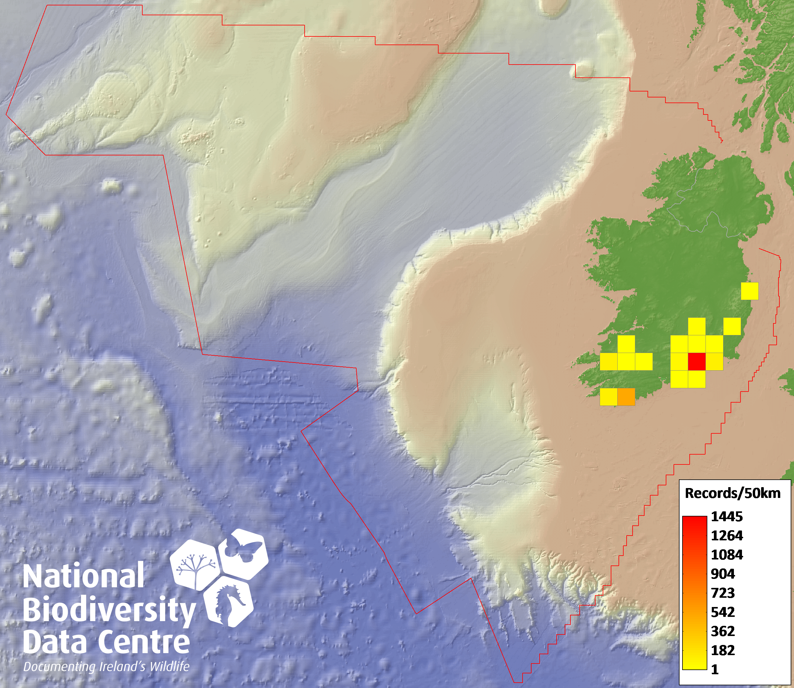 Distribution of the number of records recorded within each 10km grid square (ITM).Marine Map - 50km