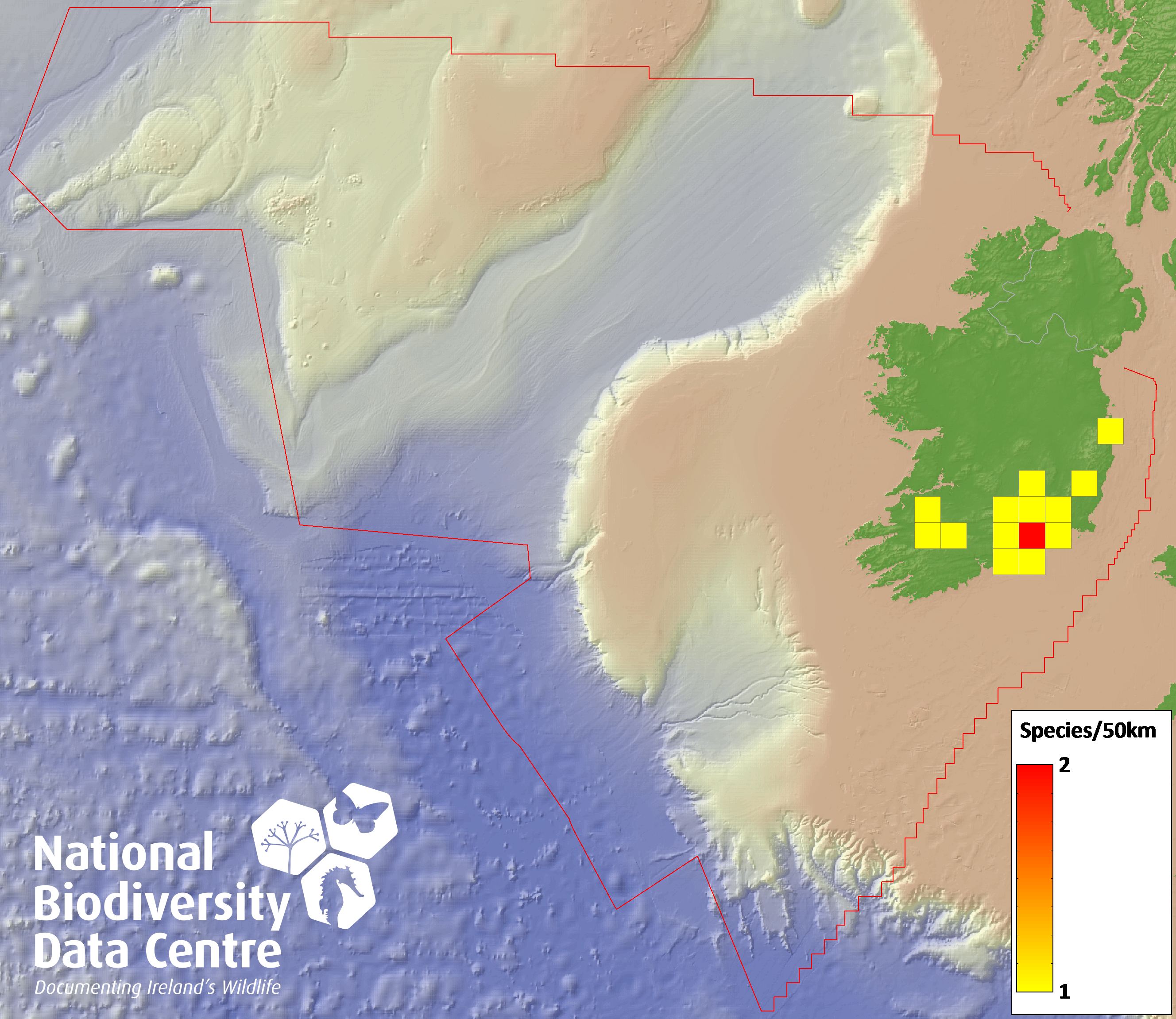 Distribution of the number of records within each 10km grid square (ITM).Marine Map - 50Km