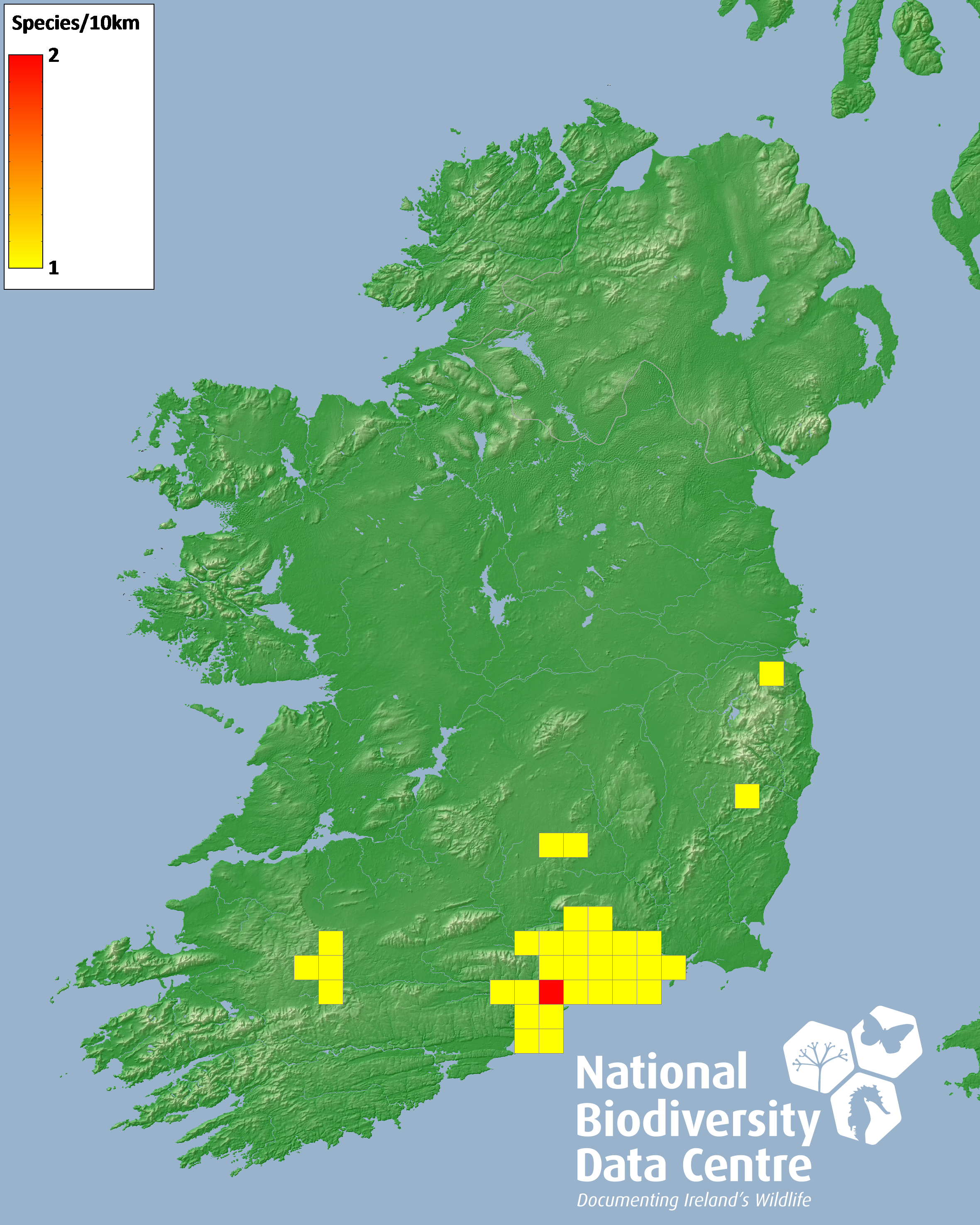 Distribution of the number of species recorded within each 10km grid square (ITM).Marine Map - 50Km