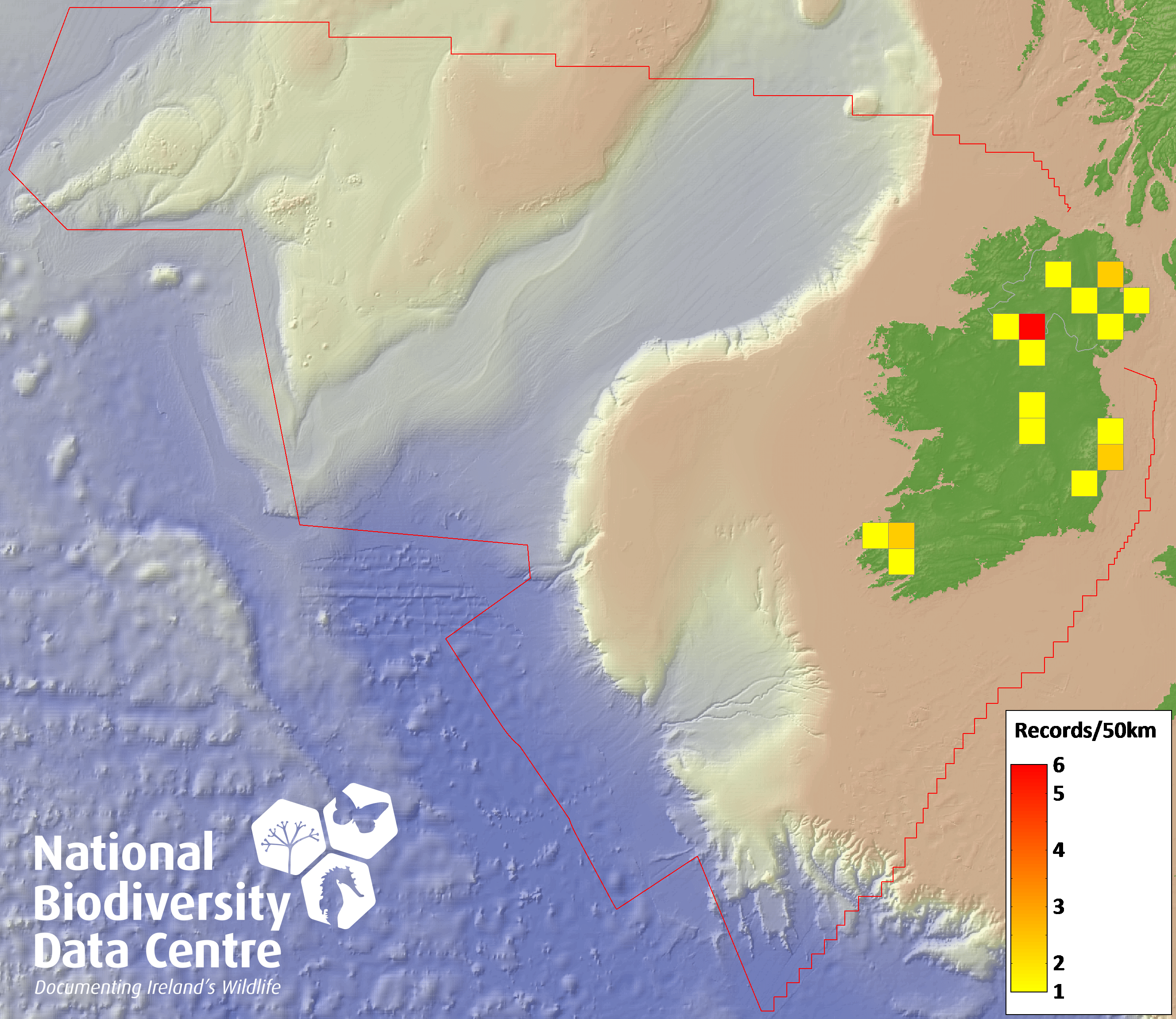 Distribution of the number of records recorded within each 10km grid square (ITM).Marine Map - 50km