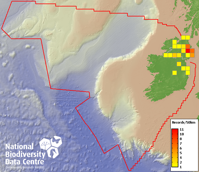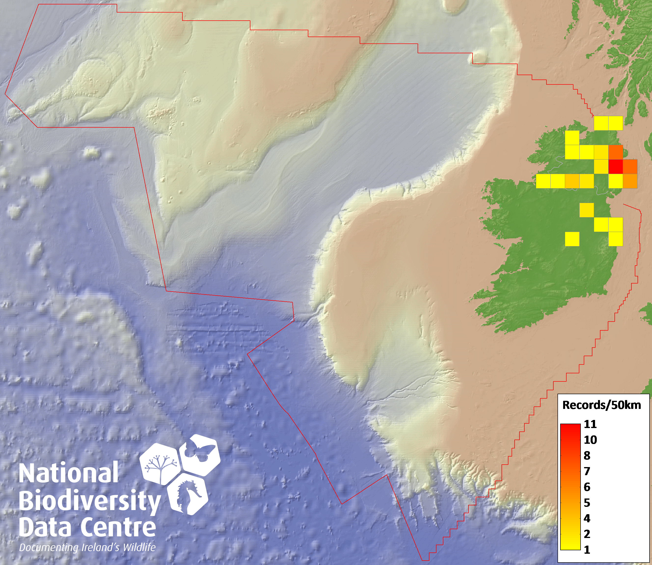 Distribution of the number of records recorded within each 10km grid square (ITM).Marine Map - 50km