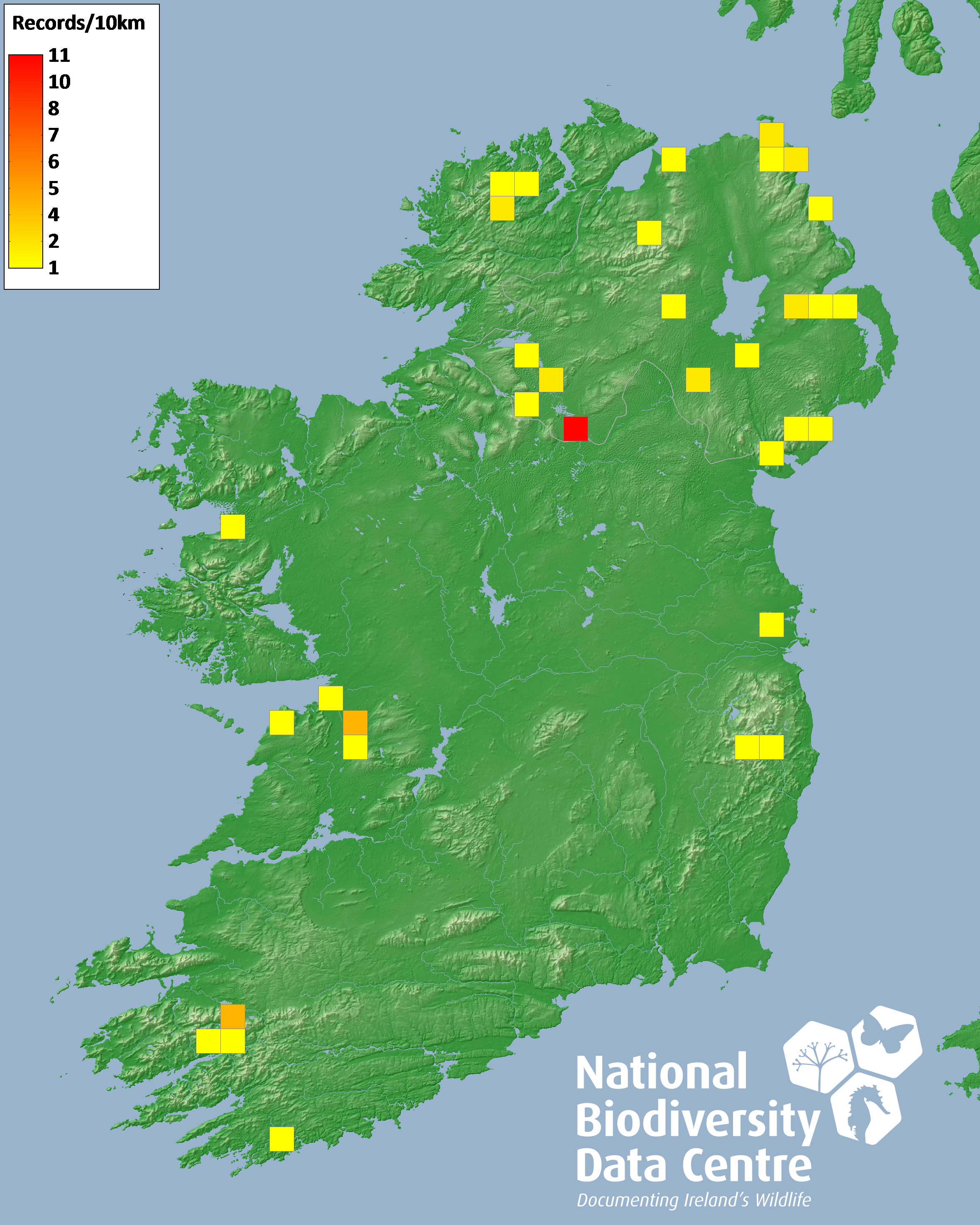 Distribution of the number of records recorded within each 10km grid square (ITM).Marine Map - 50km