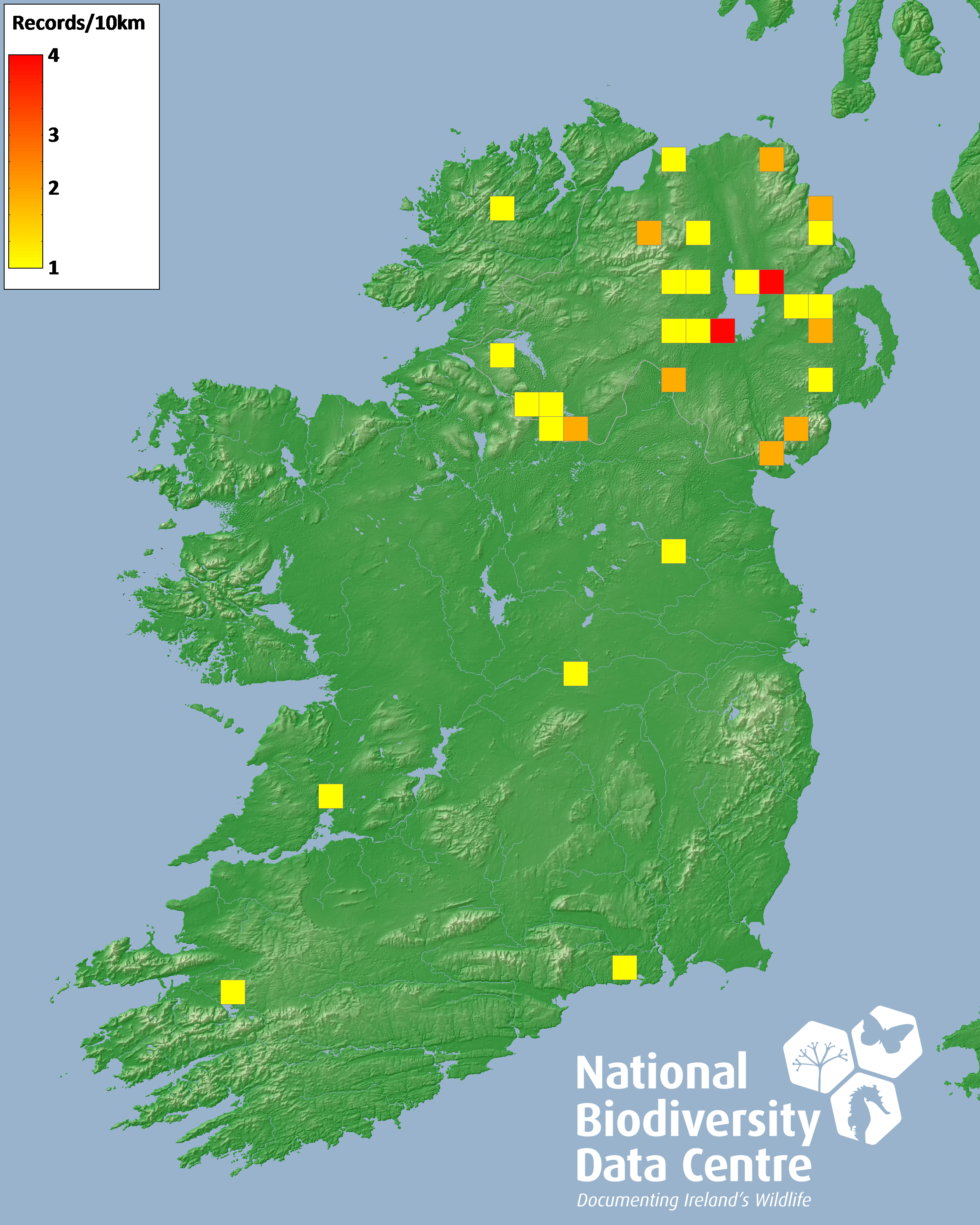 Distribution of the number of records recorded within each 10km grid square (ITM).Marine Map - 50km