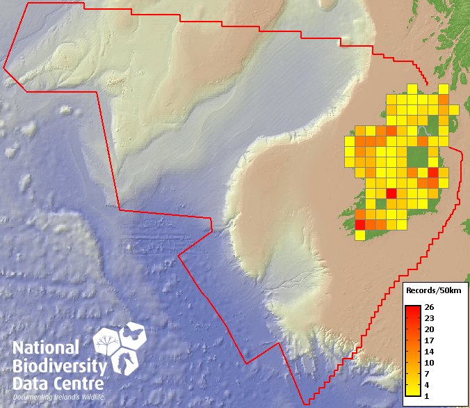 Distribution of the number of records recorded within each 10km grid square (ITM).Marine Map - 50km