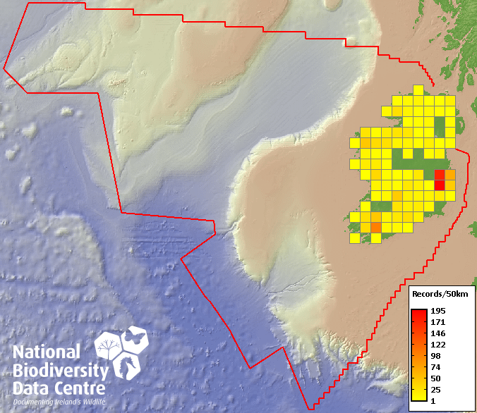 Distribution of the number of records recorded within each 10km grid square (ITM).Marine Map - 50km