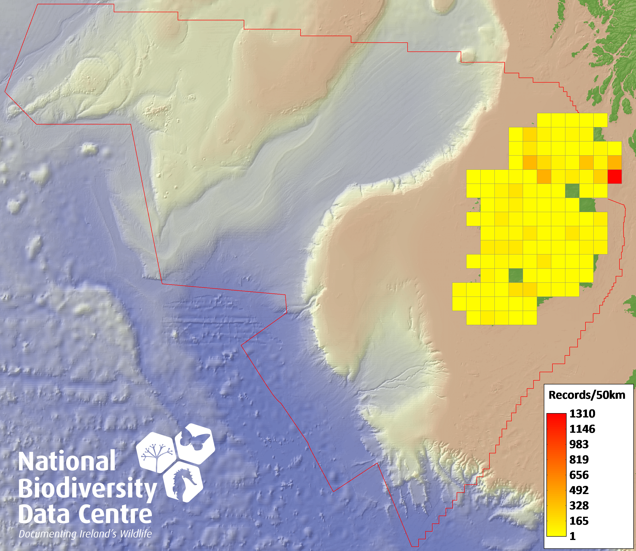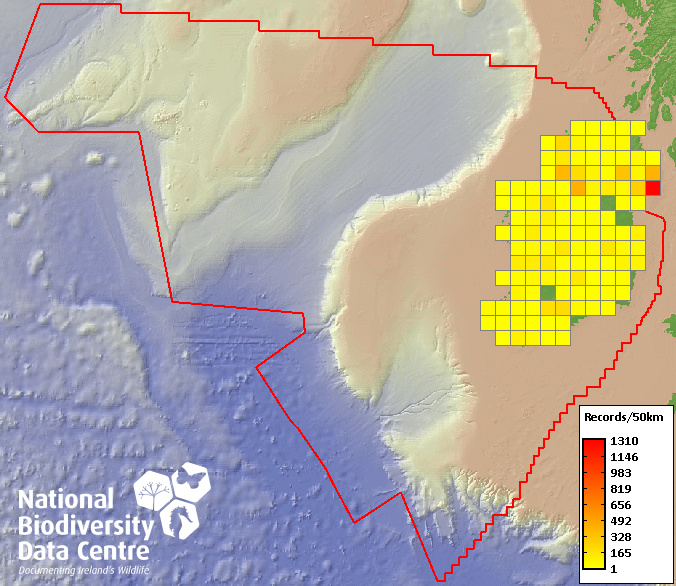 Distribution of the number of records recorded within each 10km grid square (ITM).Marine Map - 50km