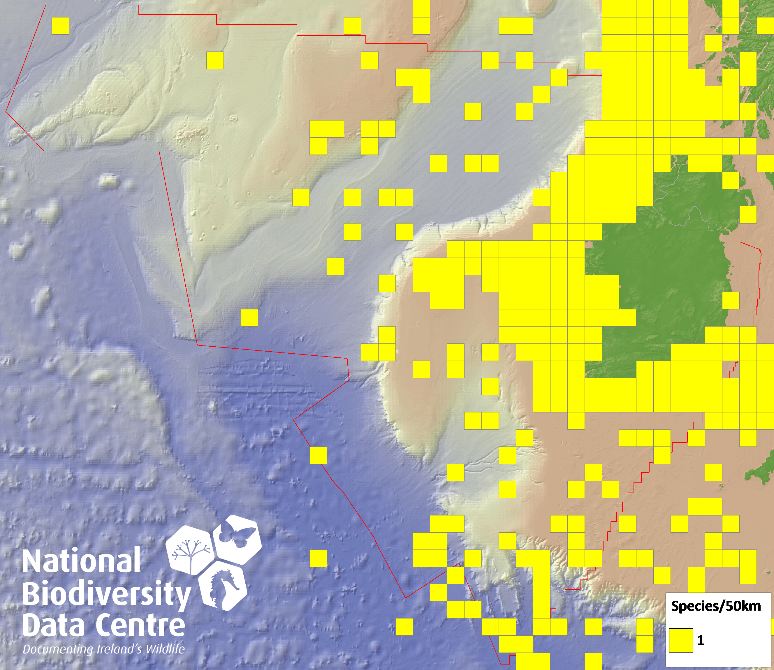 Distribution of the number of records within each 10km grid square (ITM).Marine Map - 50Km