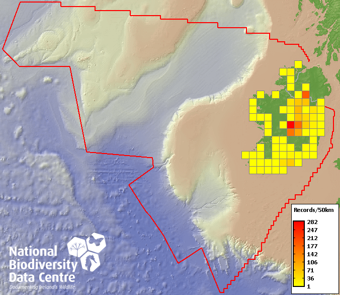 Distribution of the number of records within each 10km grid square (ITM).Marine Map - 50Km