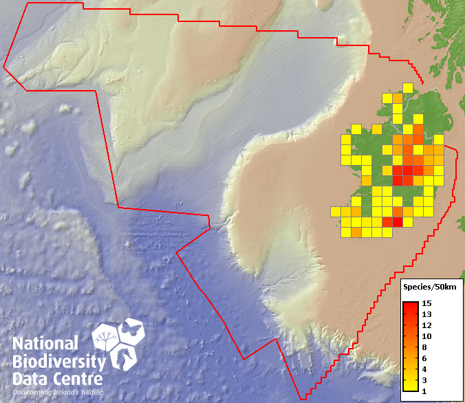 Distribution of the number of species recorded within each 10km grid square (ITM).Marine Map - 50Km
