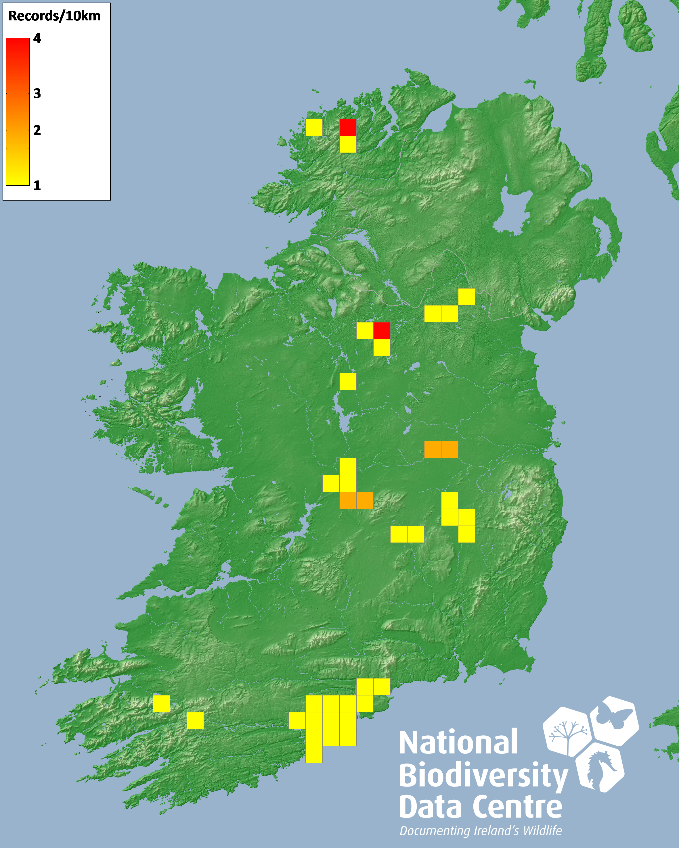 Distribution of the number of records recorded within each 10km grid square (ITM).Marine Map - 50km