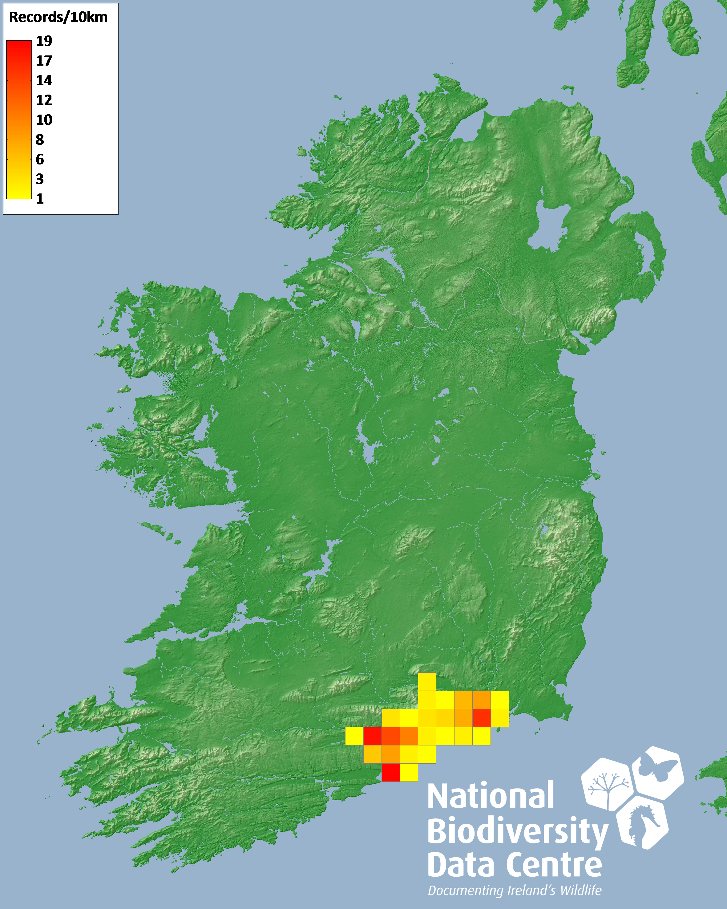 Distribution of the number of records recorded within each 10km grid square (ITM).Marine Map - 50km