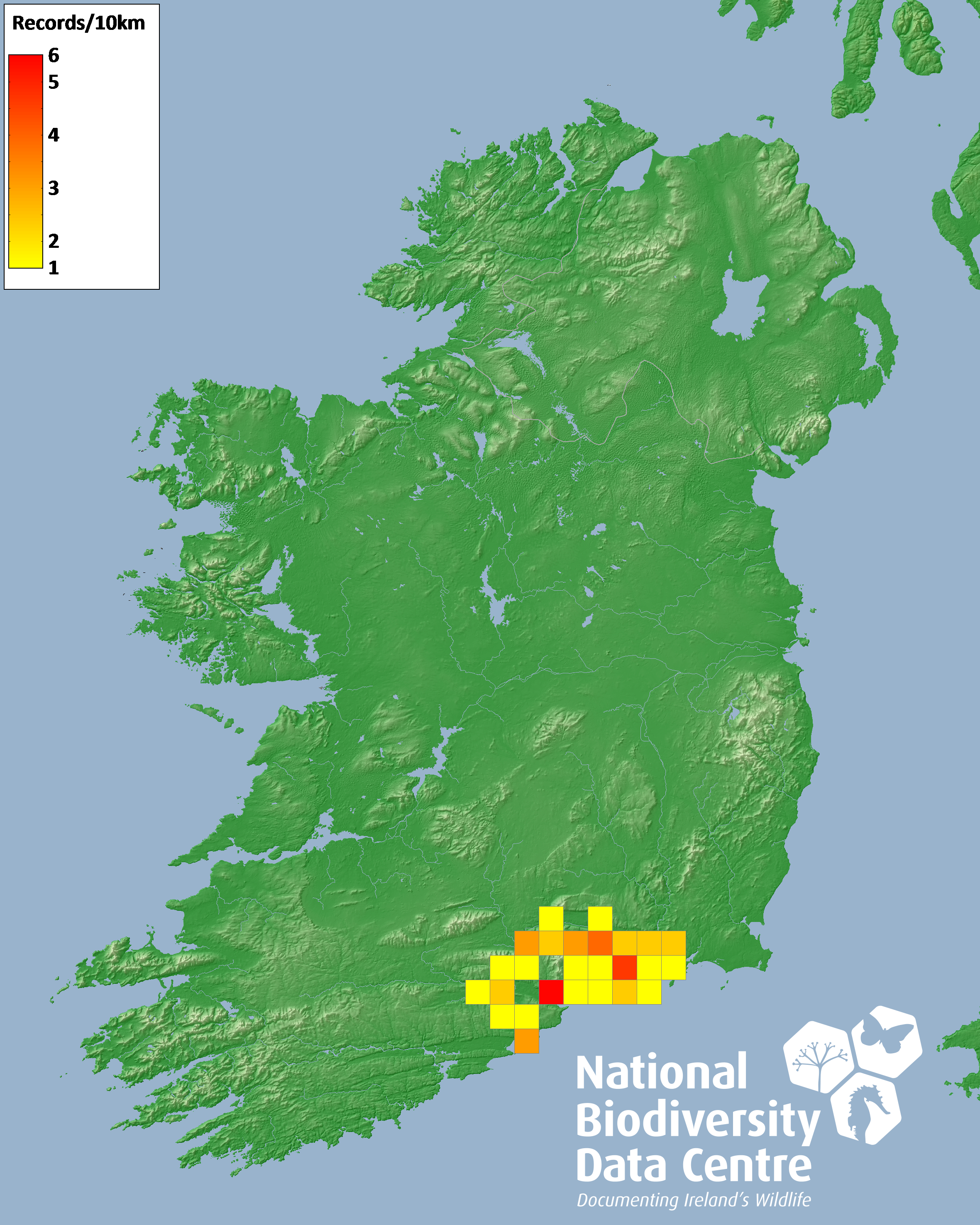 Distribution of the number of records recorded within each 10km grid square (ITM).Marine Map - 50km