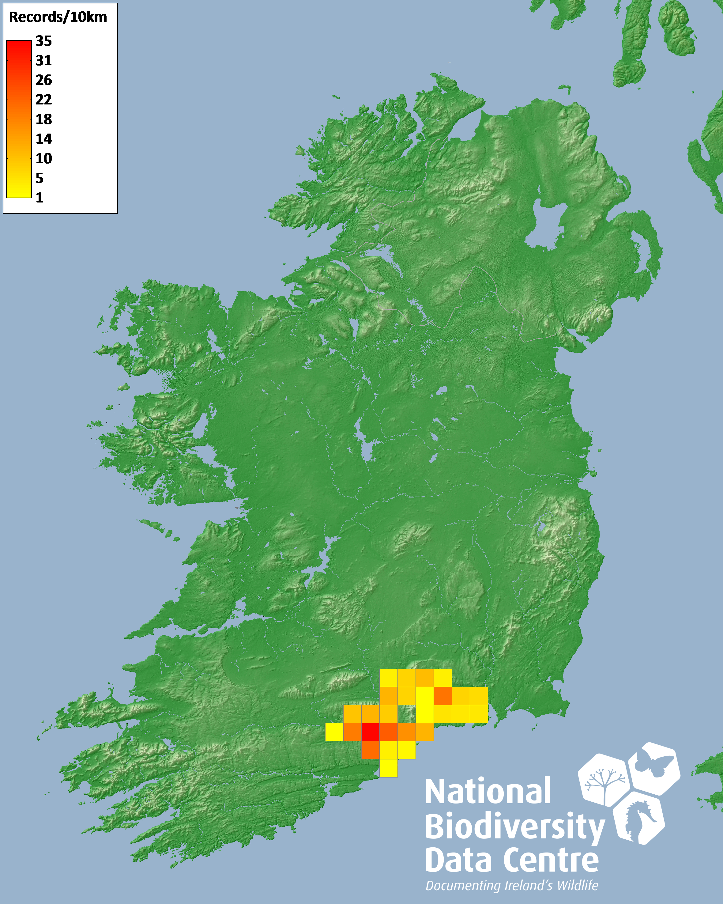 Distribution of the number of records recorded within each 10km grid square (ITM).Marine Map - 50km