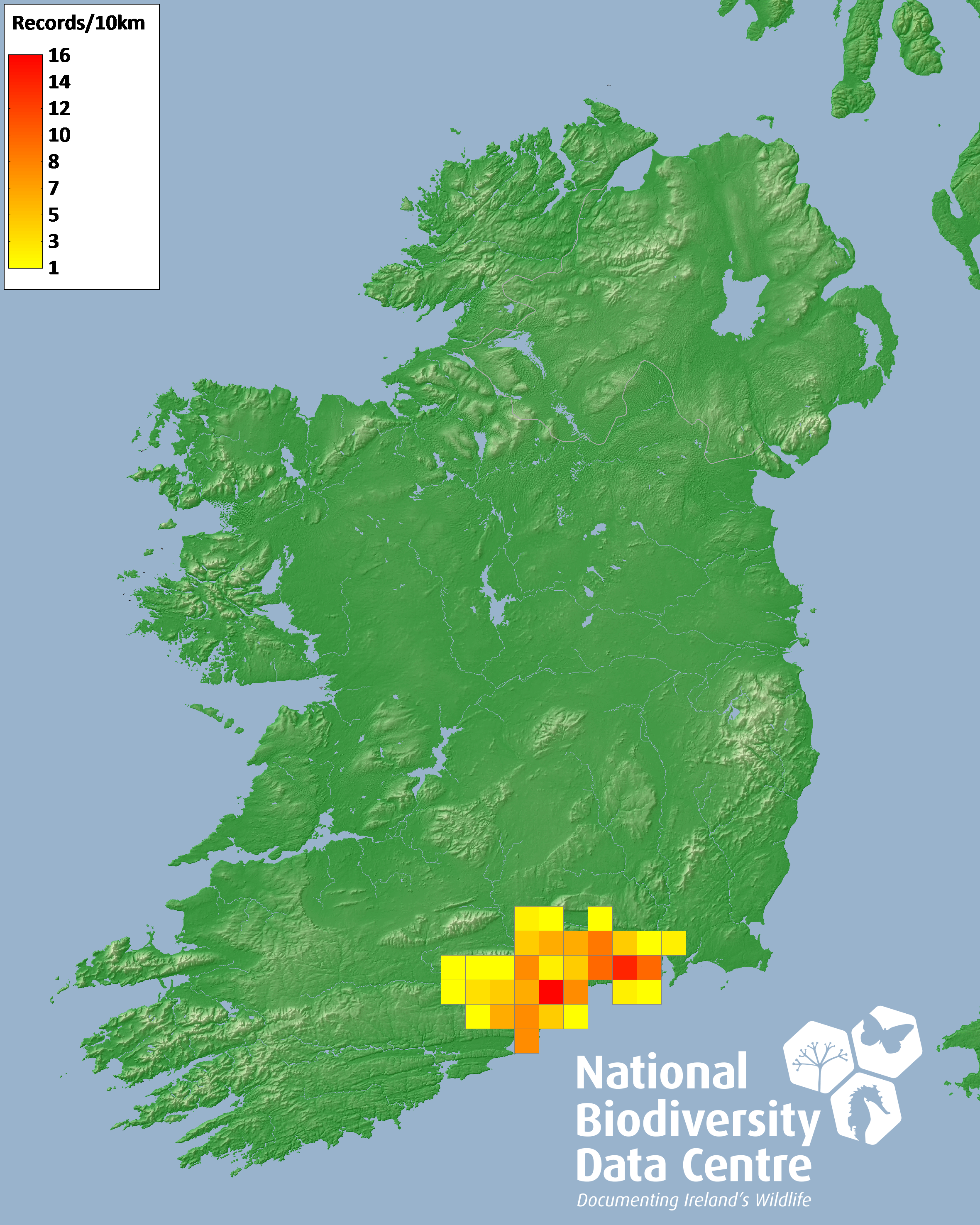 Distribution of the number of records recorded within each 10km grid square (ITM).Marine Map - 50km