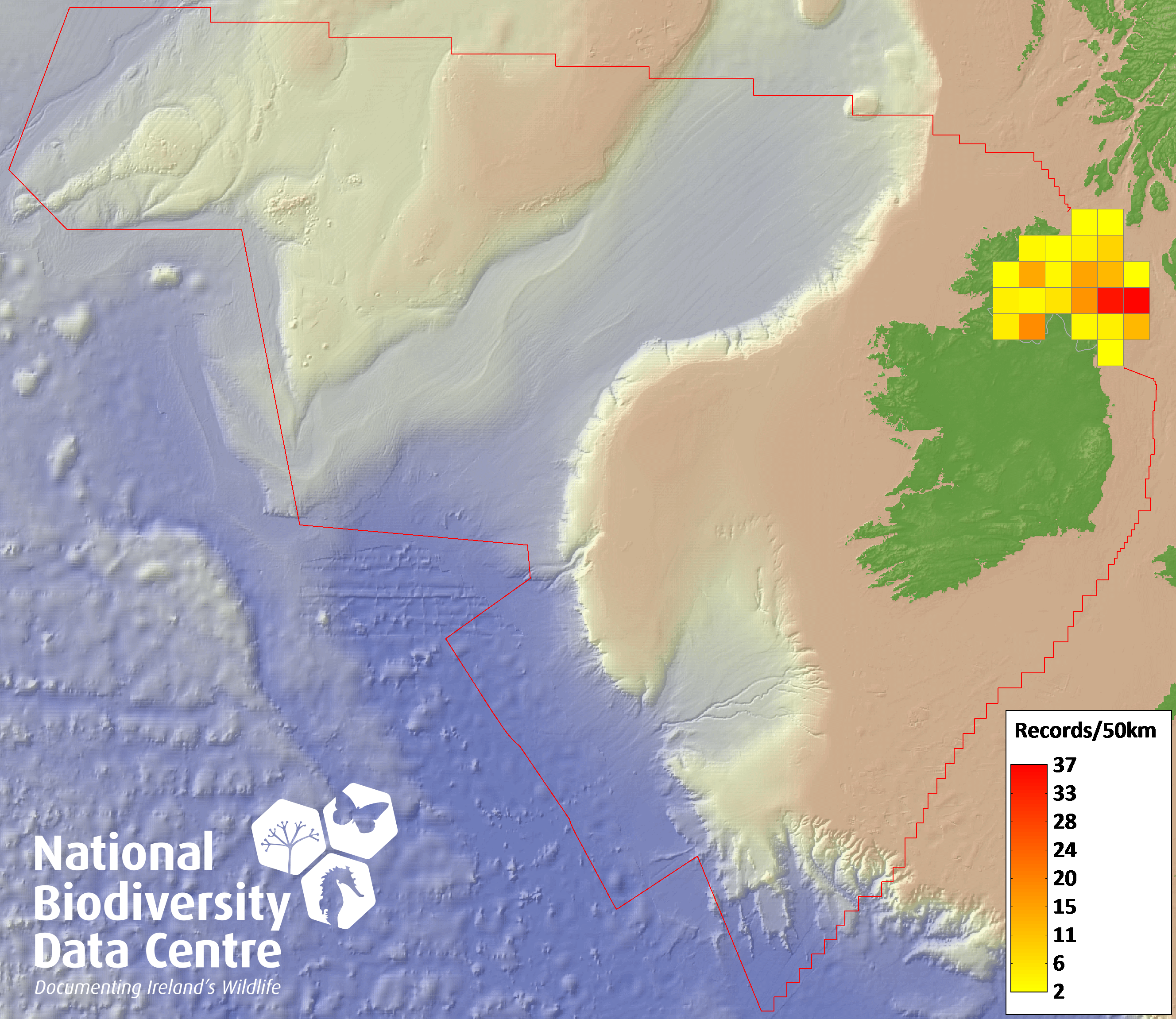 Distribution of the number of records recorded within each 10km grid square (ITM).Marine Map - 50km