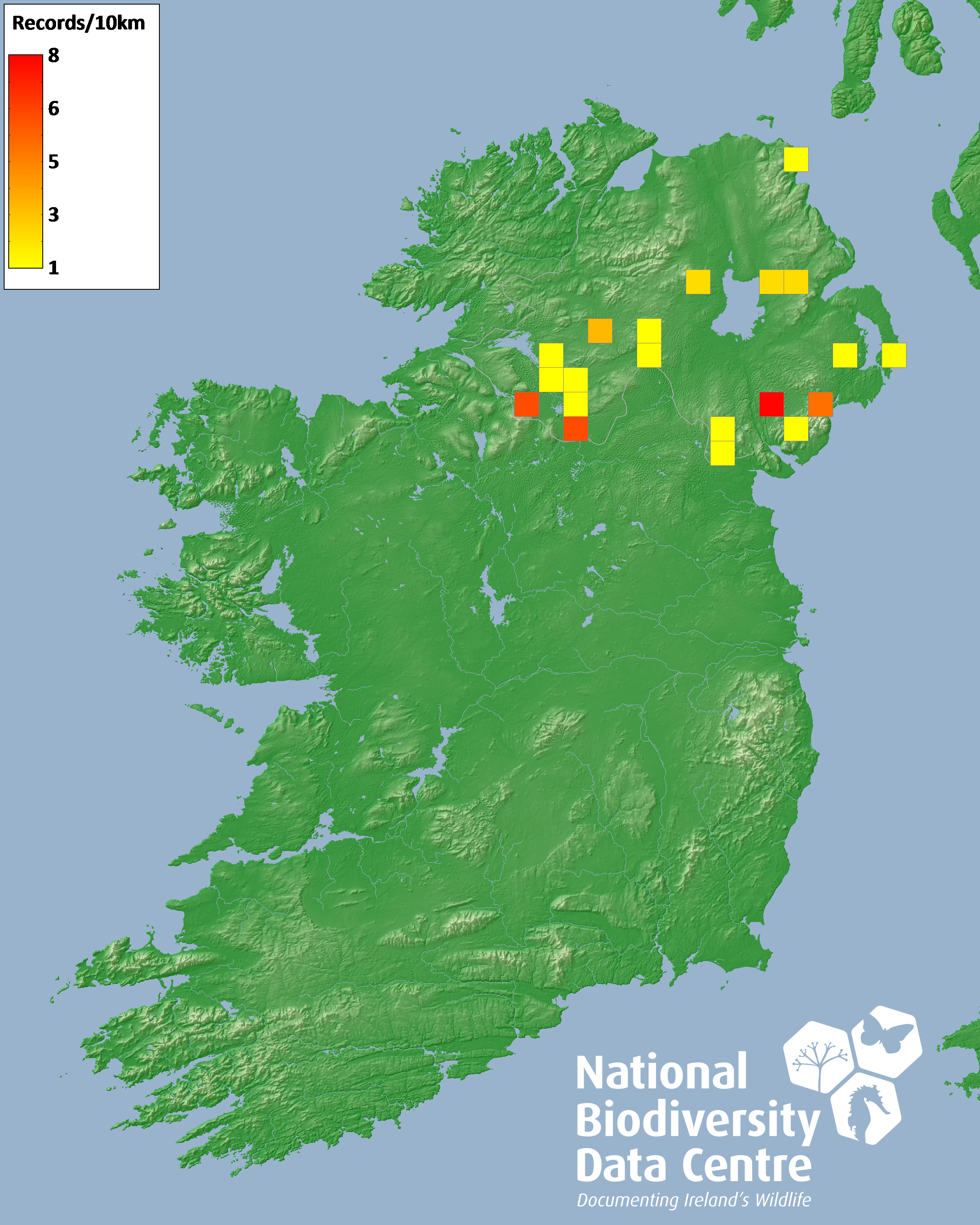 Distribution of the number of records recorded within each 10km grid square (ITM).Marine Map - 50km